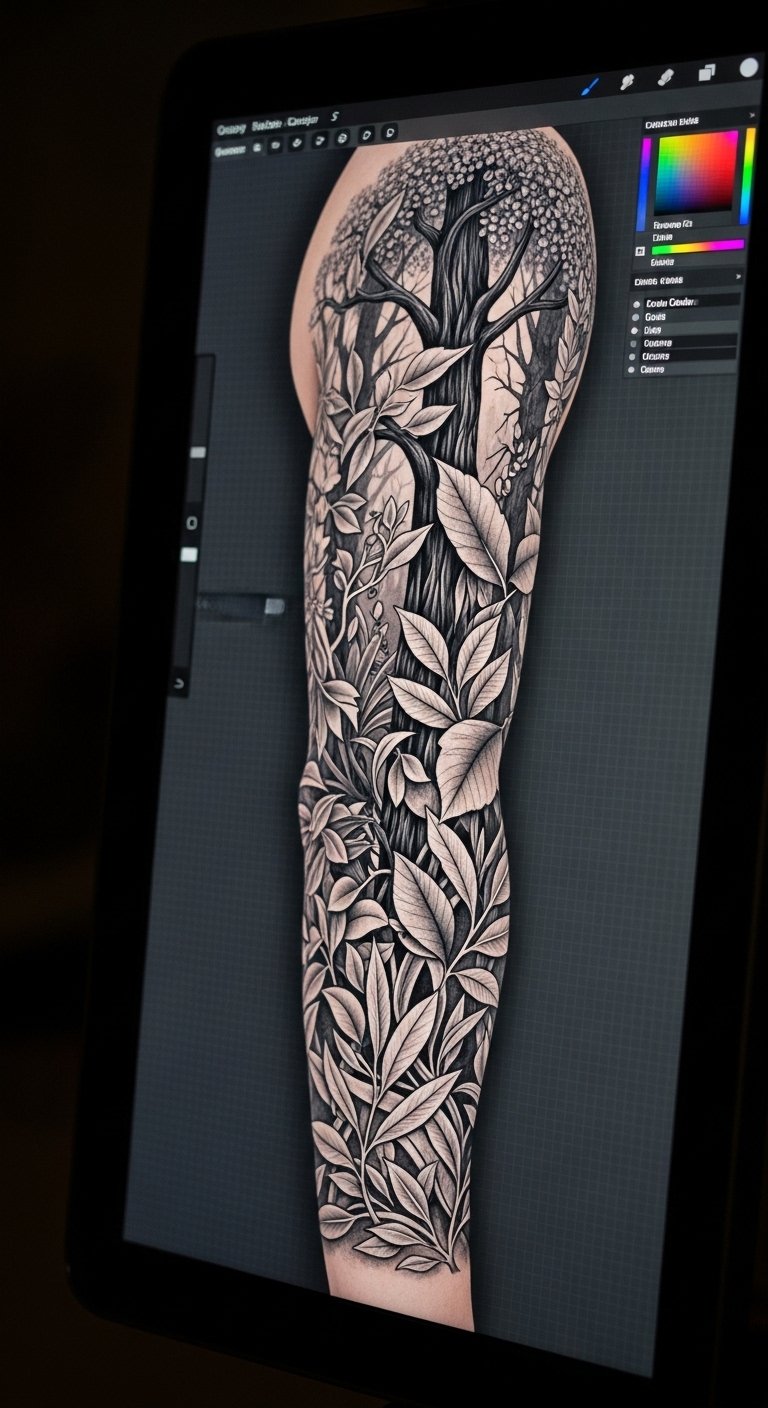 Digital previews plan forest tattoos smartly. Use free apps on your device. See how designs look before ink. Artists offer this for extra. Upload personal photos. Tweak colors easily. Previews save time. Practice at home. They make choices clear. Go digital for confidence.