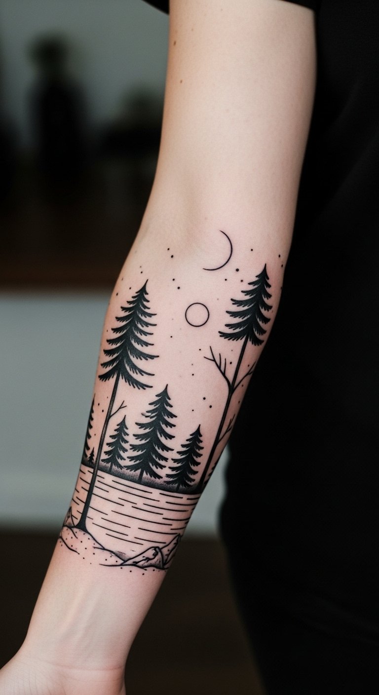Minimalist forest tattoos keep things clean and understated. Picture a few straight lines forming trees and paths. Draw basic shapes on paper with a pen to test ideas at no cost. Local shops might offer these for around $150. Use free design apps to adjust sizes on your phone. Include a small animal for added meaning. This style fits half-sleeves perfectly for subtle wear. Cover with breathable bandages during healing to avoid irritation. Try temporary tattoos first to see how it feels. Minimalist ink requires little upkeep, just regular lotion. It suits daily life without drawing too much attention.
