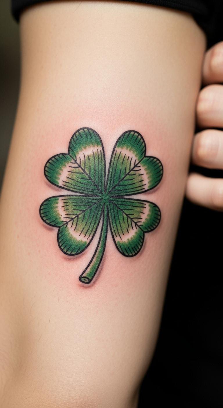 Neo-traditional styles bring bold colors to your four leaf clover, making it stand out. Imagine thick lines and bright greens that pop like a lucky charm. This design adds flair with shades of emerald and yellow for a lively feel. Sketch it at home using colored pencils to see how it fits. Opt for your shoulder to show it off or hide it as needed. Find affordable artists online who offer packages starting at $150. Mix in elements like small flowers for extra meaning. For a DIY angle, practice with washable markers on your arm. The colors stay vivid with basic care, like daily moisturizing. Sessions might take an hour, so plan for a relaxed visit. This tattoo turns everyday moments into chances for good luck, all while keeping things approachable.