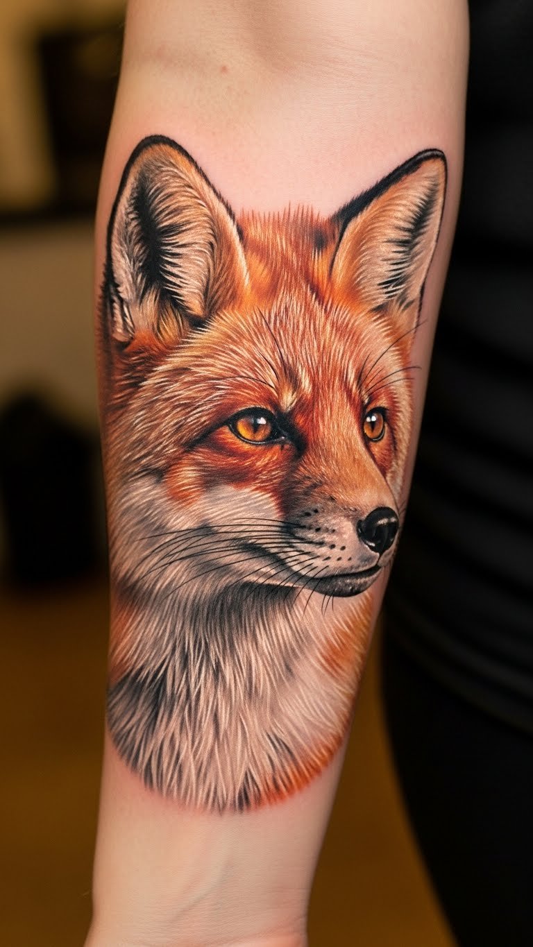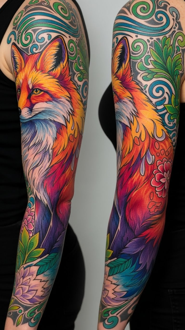 Cover your arm with a rainbow fox. Multiple colors make it lively. Start small with colored sketches. Build up the scene gradually. Budget-friendly tip: Use kid’s crayons to plan colors on paper. This keeps costs low while exploring options. Apply with temporary dyes first. Split the tattoo into phases for payment ease. This practical step ensures a big idea stays manageable.