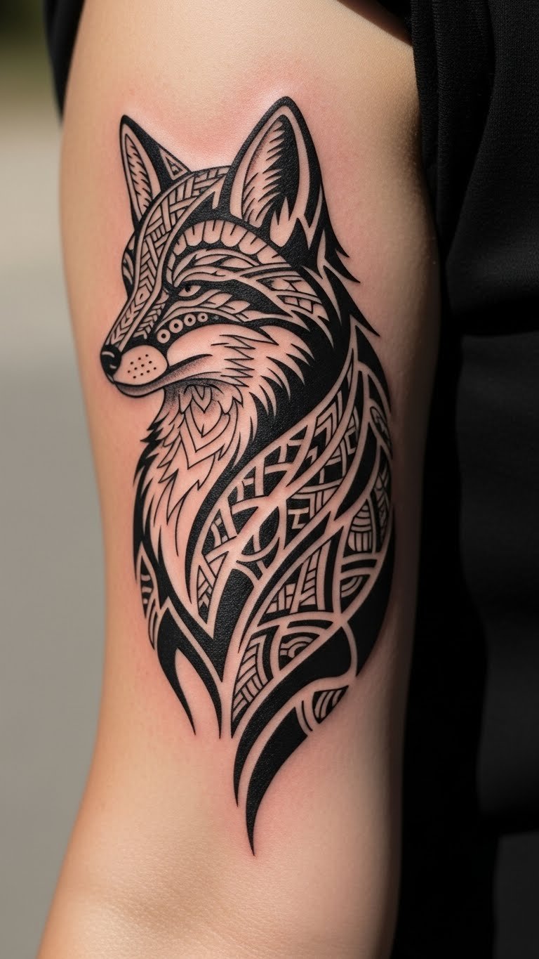 Draw from ancient styles with thick lines and patterns. This fox feels bold and timeless. Use a marker to copy tribal designs from books. Adapt them to a fox shape on plain paper. Add swirls that flow naturally. Budget-friendly tip: Practice on cardboard with a borrowed stencil kit, which you can find for free online. This lets you test the flow without ink. Choose a local parlor for application, asking for single-color options to keep fees low. Plan for a quick session to fit your schedule. It’s a straightforward way to honor traditions affordably.