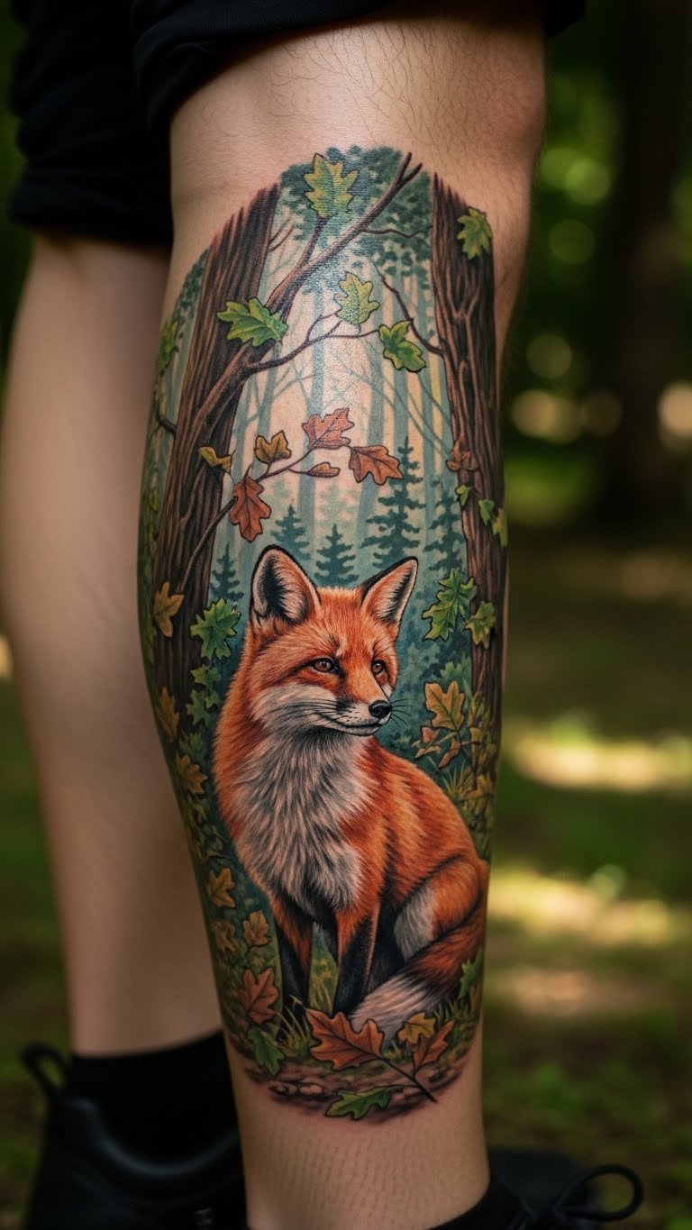 Place the fox in a wooded scene for nature vibes. Trees and leaves add depth. Draw a fox with branches around it. Add texture with shading. Budget-friendly tip: Collect leaves from outside and trace them onto paper. This brings real elements into your design. Practice with crayons on scrap paper. Choose a tattoo spot that requires less ink to cut expenses. It’s a practical way to connect with nature affordably.