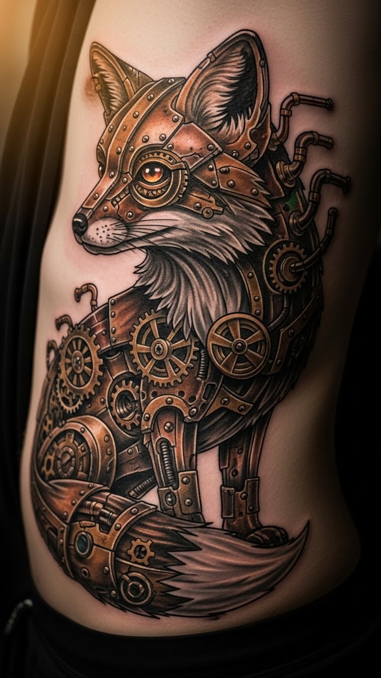 Mix fox with machines for a steampunk twist. Gears and bolts make it edgy. Sketch a fox with added tech details. Use rulers for straight lines. Realistic DIY example: Build a small model from bottle caps at home; it’s free with recyclables. Draw the concept on your skin with markers. Opt for a black-and-white tattoo to save on complex colors. This method keeps innovation within reach and budget-friendly.