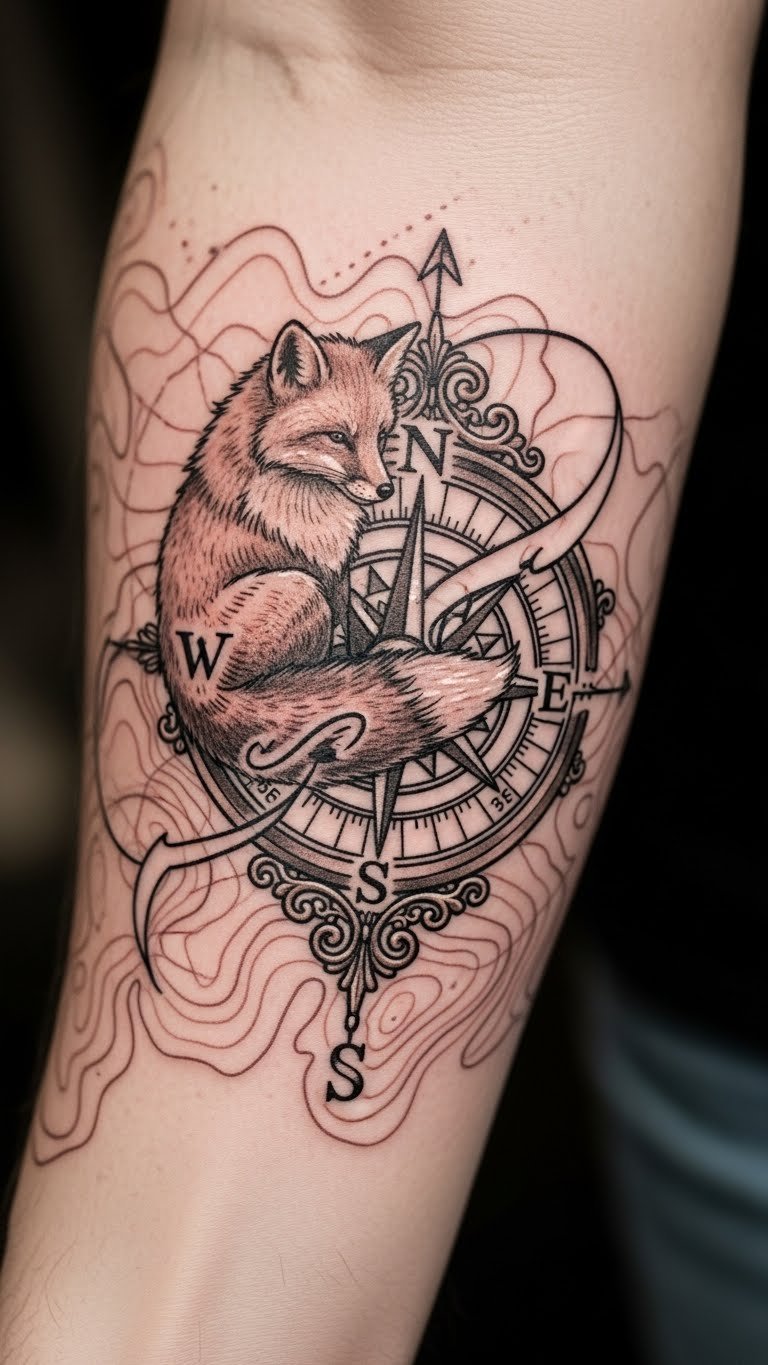 Add a compass to show direction in life. The fox guides the way. Sketch a fox holding a compass rose. Label points simply. Budget-friendly tip: Draw on a map from home to combine elements. This uses what you have already. Try with string and pins for layout. Opt for line work only in the tattoo for lower prices. It’s an actionable way to symbolize journeys.