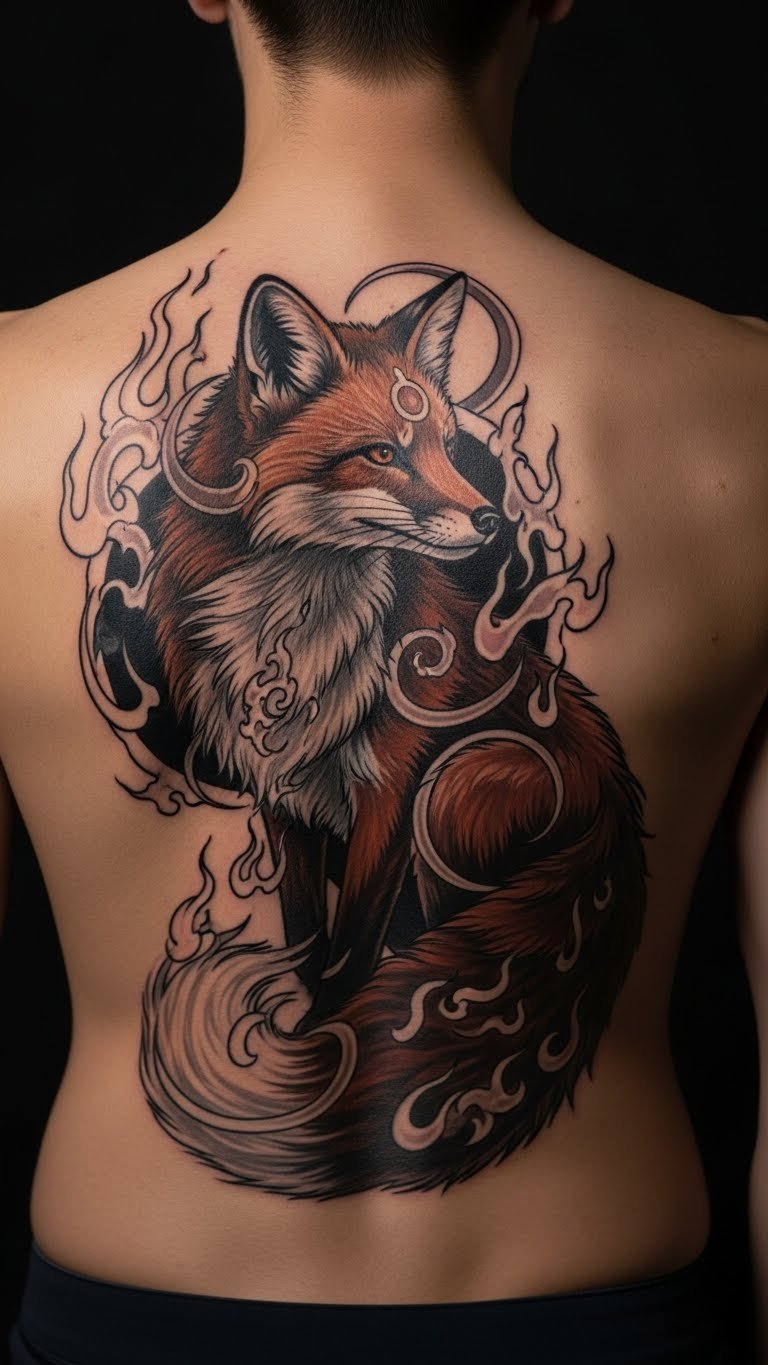 Give the fox a magical aura with flames or wings. This adds fantasy. Outline the base and enhance with extras. Use imagination freely. Realistic DIY example: Cut mythical shapes from paper and overlay on a mirror. This previews the effect at home. Practice with pastels for color. Choose essential details for an affordable tattoo. Keep it focused for easy execution.