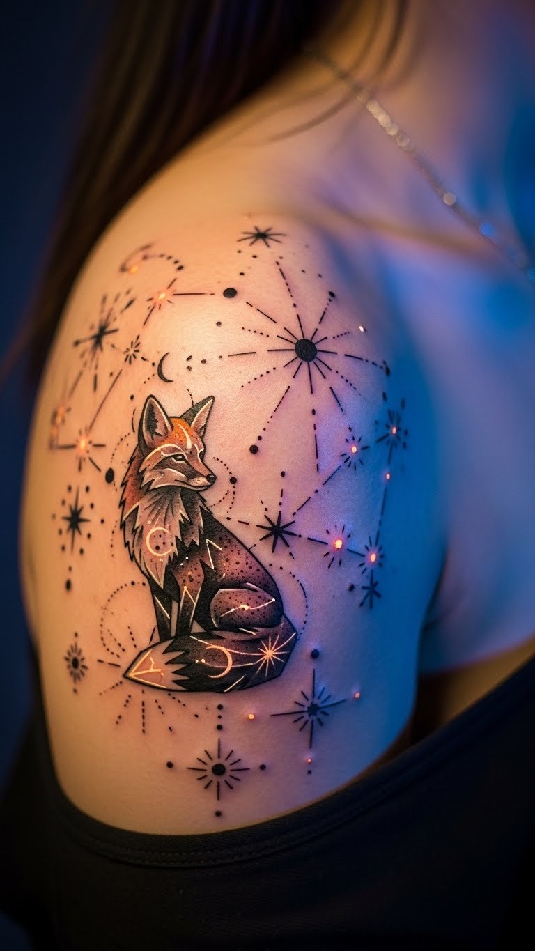 Pair the fox with twinkling stars for wonder. Dots create a galaxy effect. Plot stars around a fox sketch. Keep it sparse for balance. Budget-friendly tip: Use stickers on a dark surface to plan the stars. They cost little and aid visualization. Draw with a fine tip pen first. Go for dot techniques in the tattoo to minimize time. This simple method brings the cosmos to you.