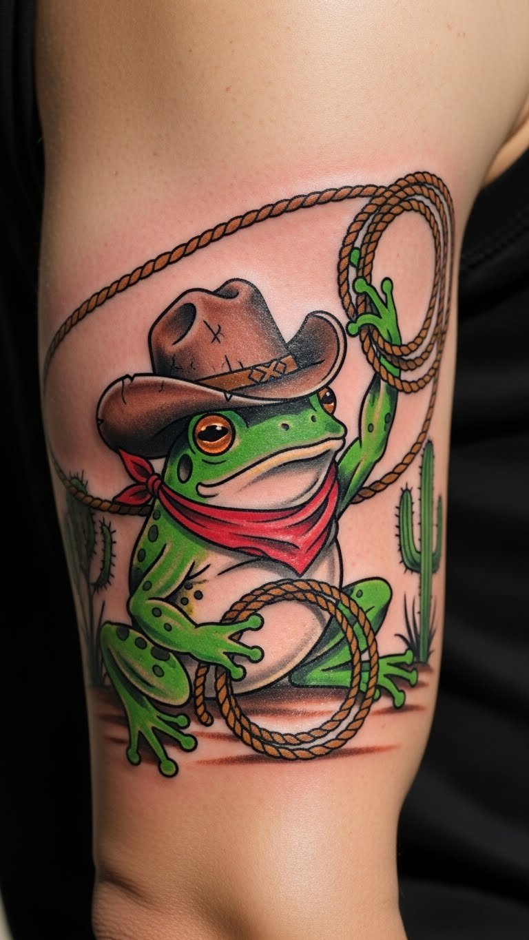 Give your frog a wild west twist. Picture a frog in a hat or with a lasso. Start by doodling on paper at your desk. Free templates online help you begin. Add boots or spurs for fun details. Use washable markers for a trial run, costing pennies. Real tattoos can fit your budget at $60 from a nearby artist. Opt for vibrant colors to stand out. Place it on your forearm for easy show. Practice with temporary designs from the dollar store. This adds adventure to your ink without breaking the bank.