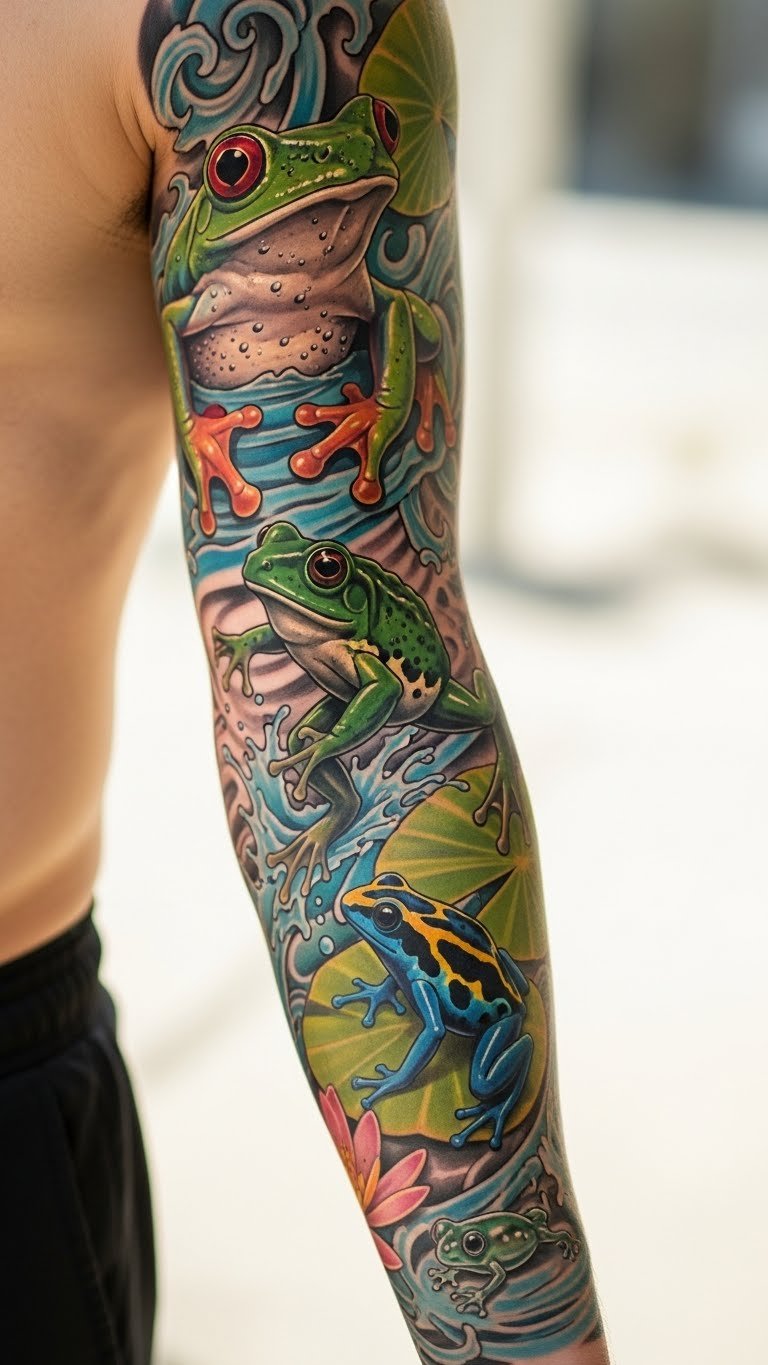 Build a full sleeve with frogs. Start with one design and expand. Use free apps to plan. Add more elements over time. Temporary sleeves help for $20. Full work might be $200. Focus on your arm. Draw step by step. This grows your ink budget-friendly.