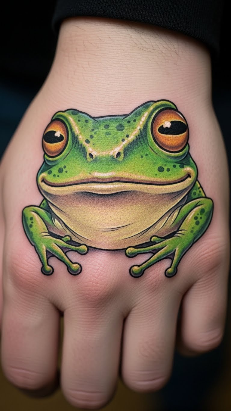 Frog tattoos suit everyone. Design for shared joy. Draw inclusive ideas. Free tools help. Keep it open. Try on simply. Get for $60. Place on hand. Share creativity. This connects affordably.