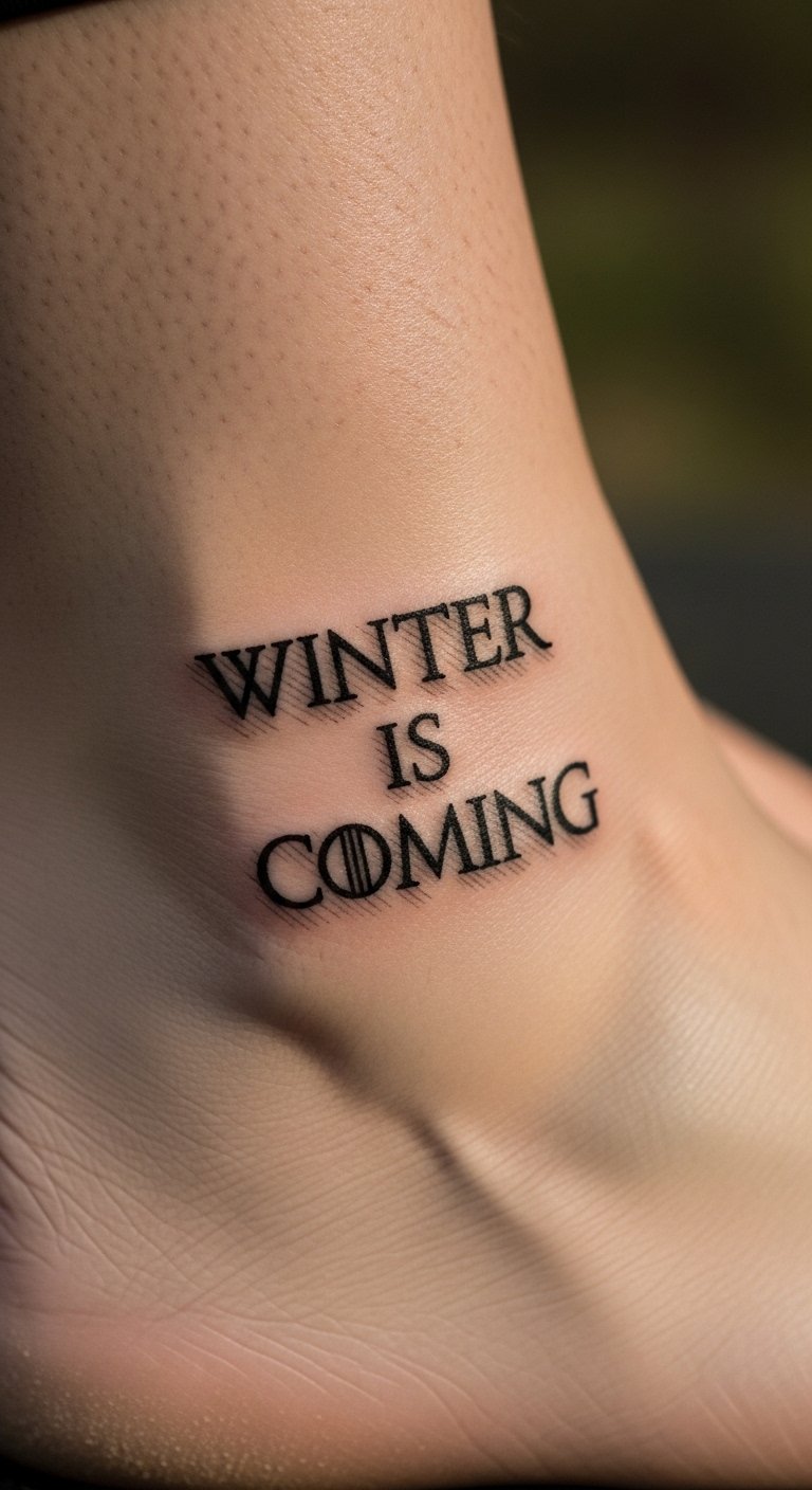 “Winter is Coming” tattoo keeps Stark wisdom close. Write it in strong letters. Sketch with household pens. Artists might charge $50. Tuck it on your neck for quick cover. Bold key: mantra design. Experiment with wash-off markers at home, free stuff. Test visibility in mirrors. Opt for small sizes to save cash. Add a wolf paw for extra meaning. Post in groups for suggestions. Easy moves like these make it accessible.