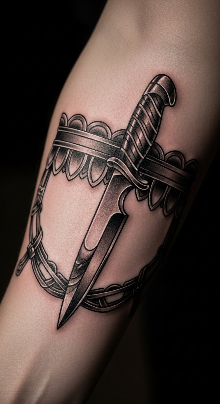 Add thrill with a knife motif in your garter tattoo—it mixes danger and passion. Imagine the blade tucked into the band for a bold edge. Save cash by researching designs online and printing them for reference. Practice with free drawing apps on your phone for a personal touch. Opt for smaller sizes to cut costs. Garter with knife amps up the excitement. Simple action: talk to a friend who’s inked for tips on affordable artists. You’ll get a design that’s fierce and meaningful in just one session.