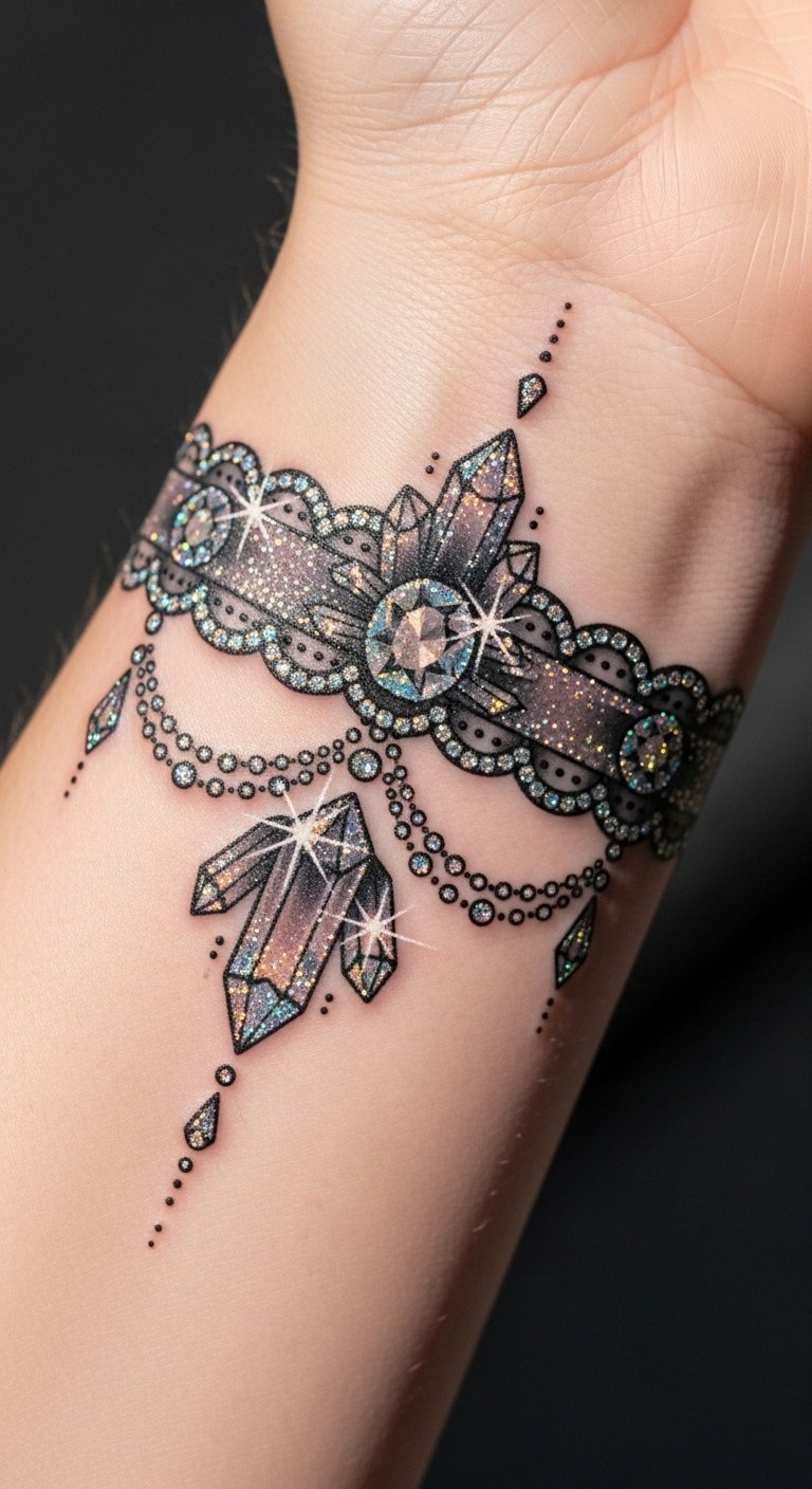 Jewels bring sparkle to garter tattoos, like tiny crystals embedded in the design. Picture gems dotting the band for elegance. Draw crystal shapes on paper as a free start. Use household items to mimic the look temporarily. Choose simple dots to keep it budget-friendly. Garter with jewels adds luxury. Tip: look for flash sales at tattoo shops. This design shines without high costs.