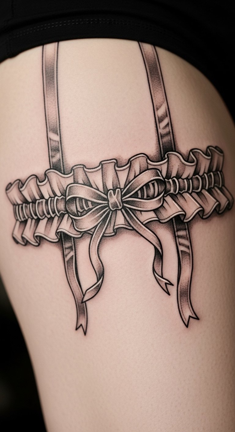 A bow adds a cute, playful twist to garter tattoos. Picture a little tie on the band for whimsy. Sketch bows on paper to start. Use actual ribbons for a home test. Choose basic shapes for savings. Garter with bow feels fun and fresh. Tip: shop around for artists with package deals. This design is easy and approachable.