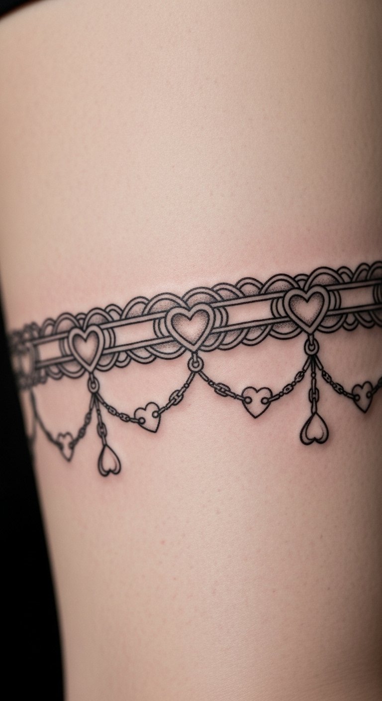 Garters for love use hearts to show commitment. See linked symbols in the design. Draw hearts on paper as a free exercise. Tie strings together for a DIY mockup. Keep symbols simple for budget reasons. This design honors relationships. Action: look for online deals on tattoo services. It’s a heartfelt option.