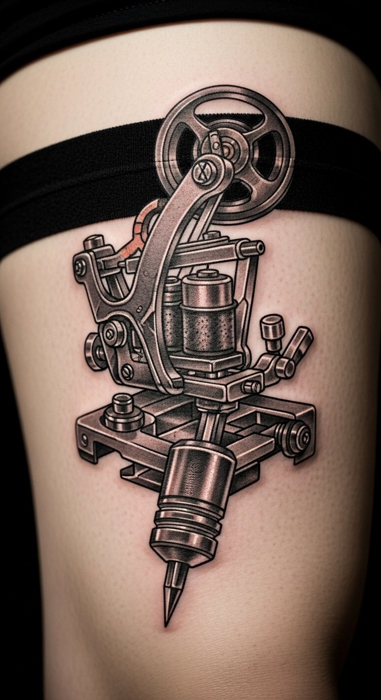 A tattoo machine in your garter adds a meta twist. See the tool in the design. Sketch machines on paper. Use photos for inspiration. Keep it quirky and small. This design nods to the art. Tip: ask for custom tweaks affordably. It’s uniquely you.