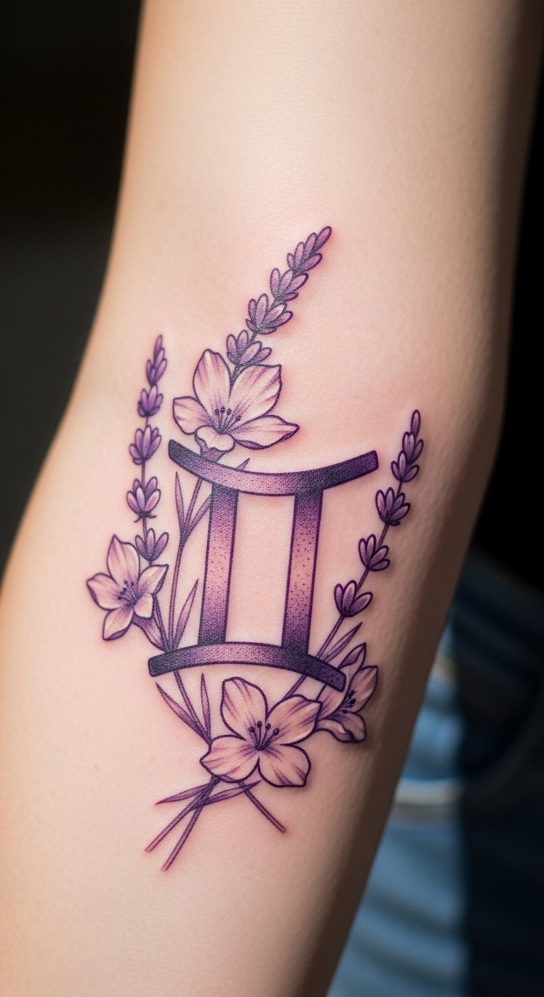 Flower elements add a soft touch to Gemini tattoos. Lavender brings calm and optimism to the mix. Draw flowers around your glyph on paper first. Free floral templates online make it easy. Artists often charge $50 for these additions. Use pressed flowers as inspiration for a DIY sketch. Place it on your neck for subtle charm. People pick this to represent rebirth in their lives. Try temporary tattoos with flower stickers before going permanent. Real examples highlight harmony through simple blooms. Stick to one flower type to keep costs down. This design grows with your story over time.