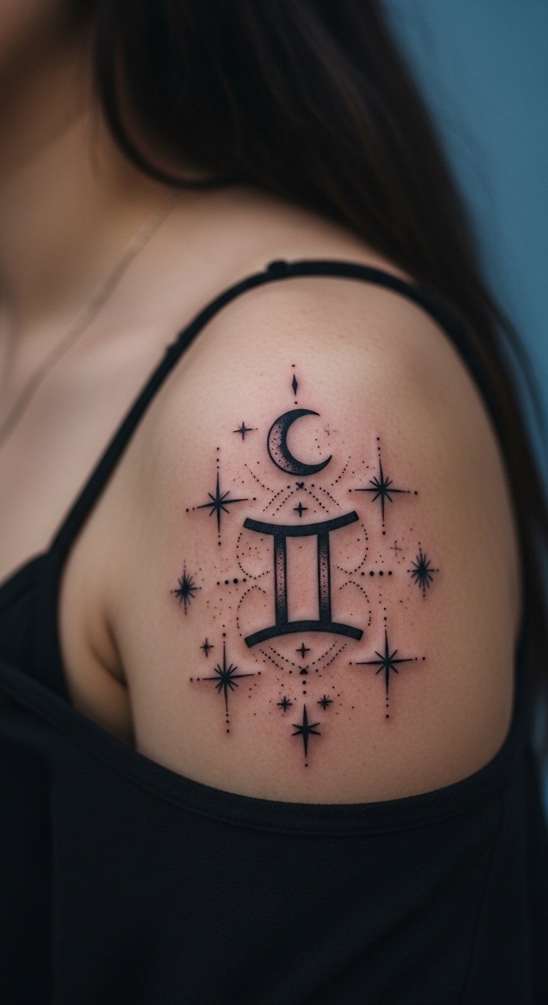 Constellation patterns make Gemini tattoos feel cosmic. Dots and lines form the twins in the sky. Sketch it freehand on paper to plan. Apps with constellation overlays are simple and cost nothing. A small version might run $40 at a walk-in shop. Add your own stars using a dotting tool if you’re artistic. Put it on your shoulder for that starry vibe. Wearers use this to connect with their sign’s roots. Practice with a stencil and ink pen at home for a trial run. Real stories show how it symbolizes eternal bonds. Keep the design sparse for affordability. This approach lets you own a piece of the universe.