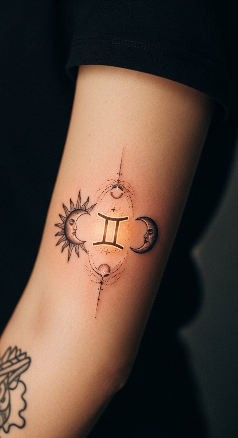 Mixing with celestial add-ons enriches Gemini tattoos. Stars and the moon balance the design. Plan on paper with star stickers. Online celestial generators are free. A combined piece might cost $55. Include just a few elements to stay affordable. Position it on your arm for flow. People select this for narrative depth. Create a mock-up with glow-in-the-dark markers at home. Real designs show passion and calm together. Focus on key stars to save time. This fusion tells a fuller story.