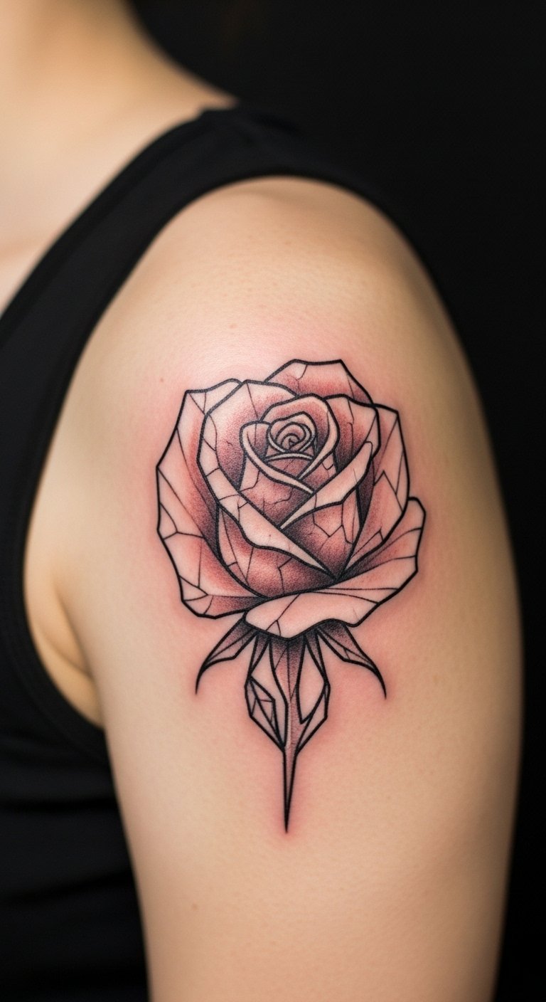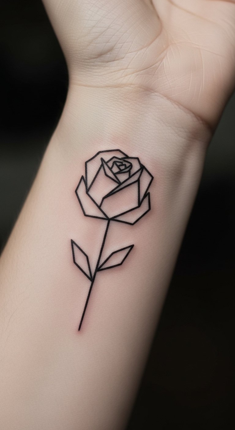 A minimalist geometric rose tattoo keeps things straightforward. Start with a basic sketch at home. Grab a pencil and paper. Draw triangles around a circle for the rose. This takes minutes and costs nothing. For practice, buy temporary tattoos online for under $5. They let you test the look. If you like it, visit a nearby shop. Ask for simple line work. These tattoos fit small spots like your wrist. Think about adding a dot for a twist. Keep costs low by choosing black ink only. It might save you $50 on color. Try this design for daily wear. It’s easy to cover with a watch. Have fun experimenting.