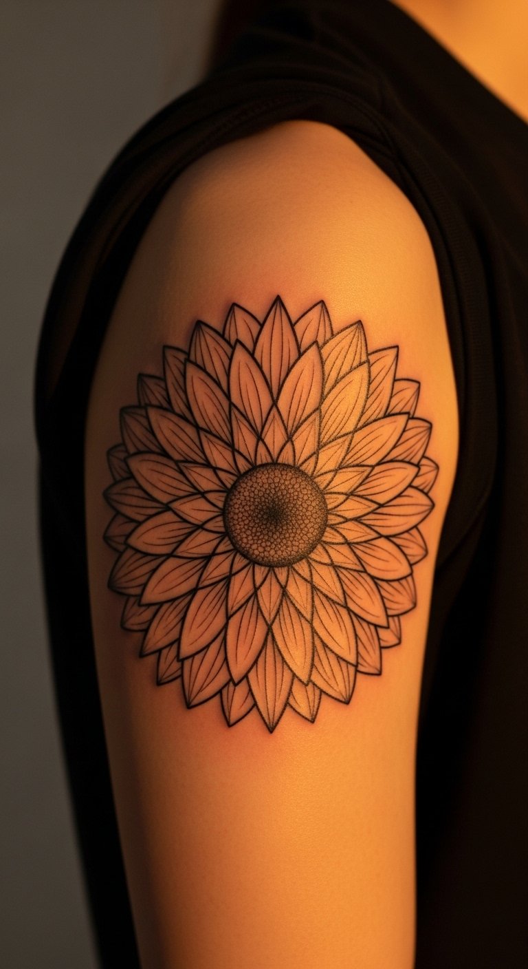 A geometric sunflower mandala tattoo adds symmetry to your arm. Begin by tracing circles on paper. Use a ruler for even lines. This helps plan the design. Pick up affordable stencils from a craft store for $2. They make drawing easier. If you’re ready, get a friend to help with henna. It washes off after a week. Look for artists who do mandalas locally. Check their photos first. This tattoo works great on your back. Add a small center dot for meaning. Go for black and gray to cut expenses. You could save $100 that way. Wear it as a focal point. It’s perfect for sunny days.