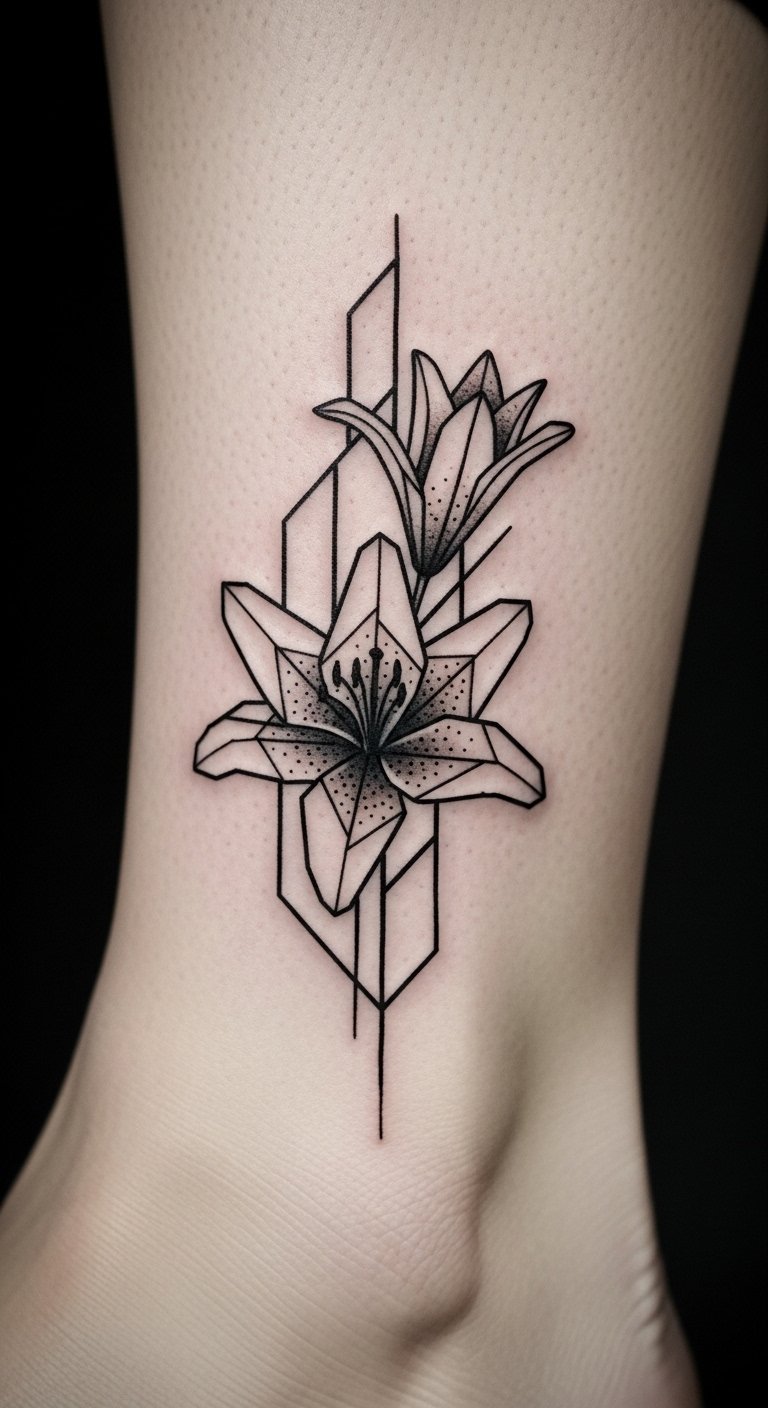 An abstract geometric lily tattoo plays with angles on your skin. Start simple. Draw wavy lines with a marker. Add squares for the petals. Do this on your hand first. Temporary versions cost about $3 online. They give you a feel without commitment. Find an artist online who focuses on abstracts. Share your sketch with them. Place it on your ankle for a hidden gem. Customize with extra lines for a story. Opt for fine lines to keep prices down. This might mean $20 less per session. Use it to mark a milestone. It’s versatile for outfits.