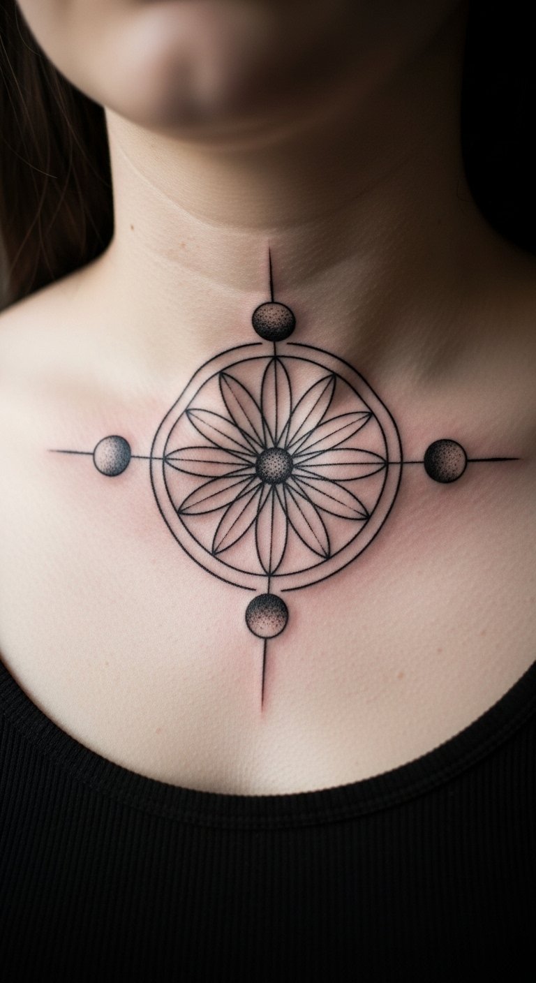 A symmetric geometric daisy tattoo brings balance to your collarbone. Sketch it out with a compass. Draw even circles and lines. This takes five minutes at your desk. Cheap drawing tools cost $1 at a store. Try a washable marker version on your arm. If it clicks, seek local tattoo pros. Show them symmetry ideas. Put it on your shoulder for easy viewing. Tweak the petals with personal symbols. Choose basic ink to save money. You could pay $30 less. Make it part of your routine. It’s ideal for casual looks.