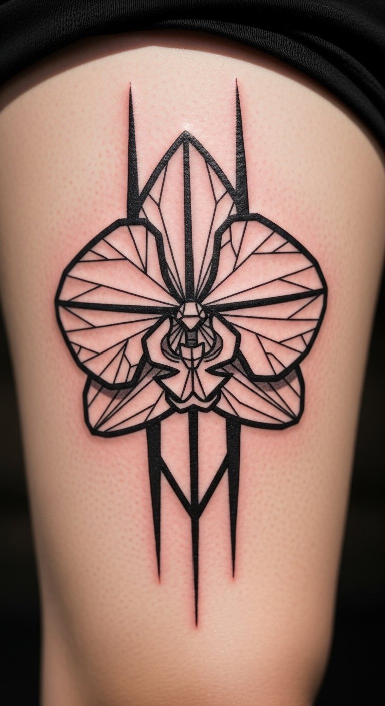 A bold geometric orchid tattoo makes a statement on your thigh. Begin with thick strokes on paper. Use a bold pen for the shapes. Do this in your free time. Printable templates online are free. Test with henna kits under $10. They last a few days. Connect with artists who handle bold styles. Bring your drawing along. Position it on your leg for impact. Add geometric twists for flair. Go with solid colors to reduce costs. This saves about $40. Wear it proudly at events. It’s a conversation starter.