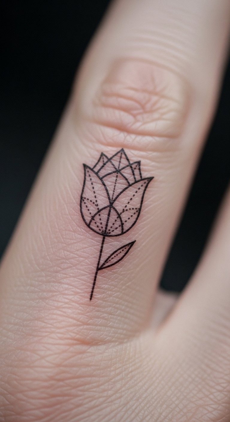 A delicate geometric tulip tattoo fits neatly on your finger. Start by outlining thin lines on paper. Use a fine-tipped pen. It helps visualize quickly. Free apps on your phone offer design tools. Practice with stick-on tattoos for $4. They peel off easily. Find finger tattoo experts nearby. Discuss size options. Keep it on your hand for subtlety. Personalize with a small detail. Stick to minimal ink for budget reasons. You might spend $25 total. Use it as a daily reminder. It’s perfect for work settings.