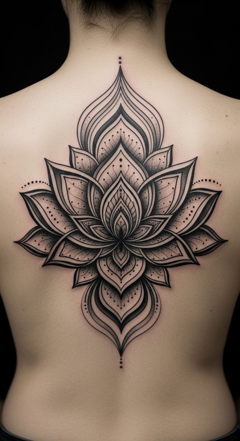 An intricate geometric lotus tattoo covers your back beautifully. Draw overlapping shapes at home. Get a grid paper for $2. It guides your design. Experiment with string art as a DIY. Materials cost under $5. Look for detailed artists in your area. Share inspiration images. Place it across your shoulder blades. Incorporate meaningful elements inside. Opt for outline styles to save cash. This cuts fees by $50. Turn it into a personal journey. It’s great for reflection.