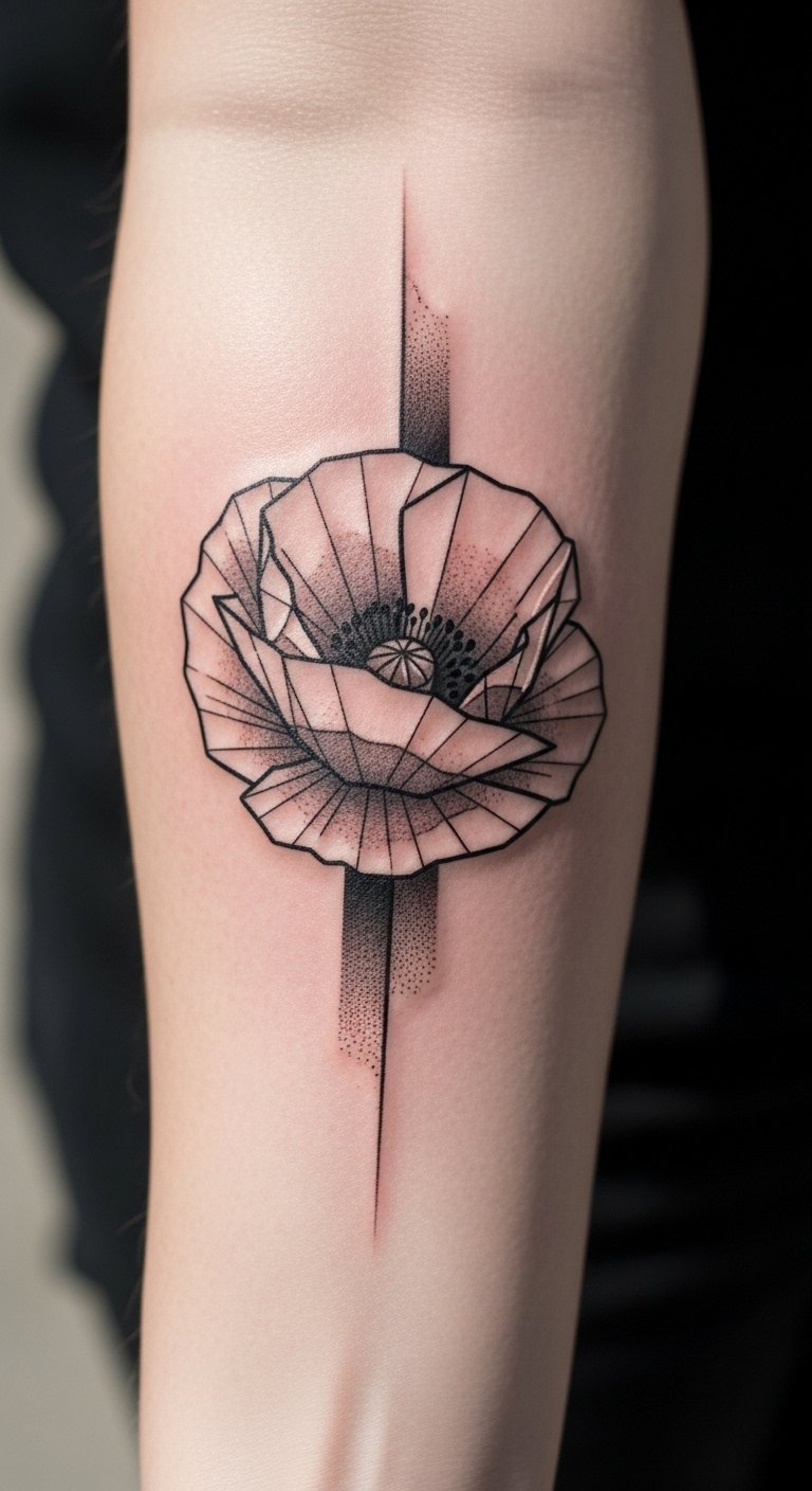 A modern geometric poppy tattoo updates your forearm. Sketch modern angles with a straight edge. Do it on scrap paper. Online tutorials are free. Try press-on versions for $3. They show the effect fast. Seek modern tattoo creators locally. Give them your ideas. Put it on your arm for visibility. Add unique cuts for style. Choose simple designs to lower costs. You could pay $20 less. Make it a fashion piece. It’s ideal for outings.