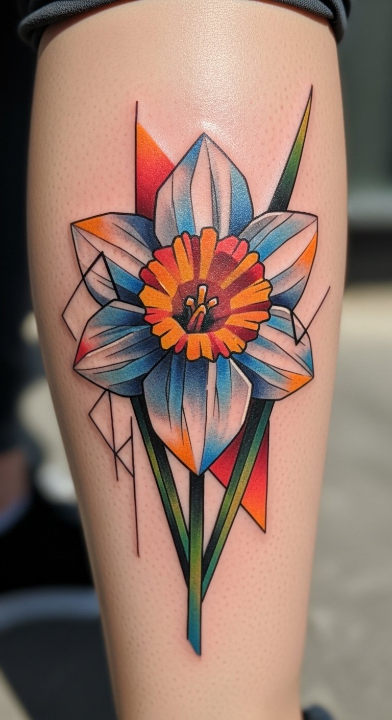 A vibrant geometric daffodil tattoo brightens your calf. Color in shapes with markers first. Use what you have at home. Free coloring pages online help. Test with colored temporary tattoos for $5. They add fun. Find color specialists near you. Talk about shade choices. Position it on your leg for movement. Include extra petals for pop. Select fewer colors to save money. This means $30 off. Let it express your energy. It’s perfect for active days.