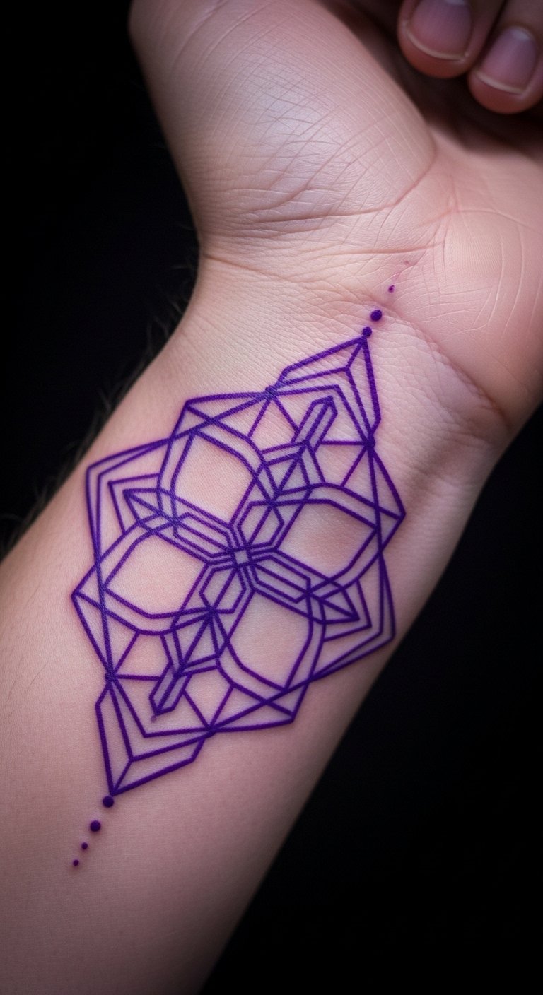A mystical geometric violet tattoo intrigues your wrist. Outline mystical symbols on paper. Use a simple tool set. Online guides are free. Experiment with mystical temporary designs for $4. They offer insight. Find mystical tattoo pros. Share your thoughts. Keep it on your wrist for mystery. Add secret meanings inside. Opt for basic outlines to reduce price. You could pay $20 less. Make it your enigma. It’s ideal for quiet moments.