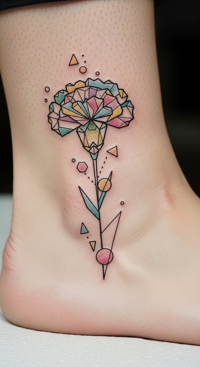 A whimsical geometric carnation tattoo charms your ankle. Draw light-hearted shapes quickly. Use everyday pens. Fun apps provide ideas. Try whimsical stick-ons for $2. They add whimsy. Connect with whimsical creators. Talk designs. Keep it on your ankle for fun. Add playful details. Go for light touches to lower costs. You might spend $25. Make it your delight. It’s great for adventures.