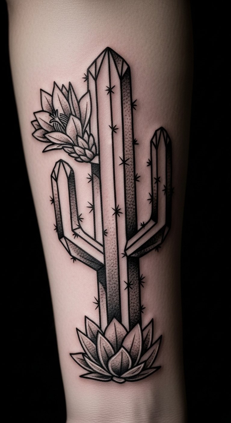 An edgy geometric cactus flower tattoo sharpens your forearm. Create sharp edges on paper. Get a straight tool for $1. Rough sketches work. Test with edgy temporaries for $4. They show the edge. Find edgy artists near. Share your edge. Place it on your arm for boldness. Add edgy lines. Choose stark styles to save money. This cuts $40. Let it show strength. It’s ideal for bold vibes.