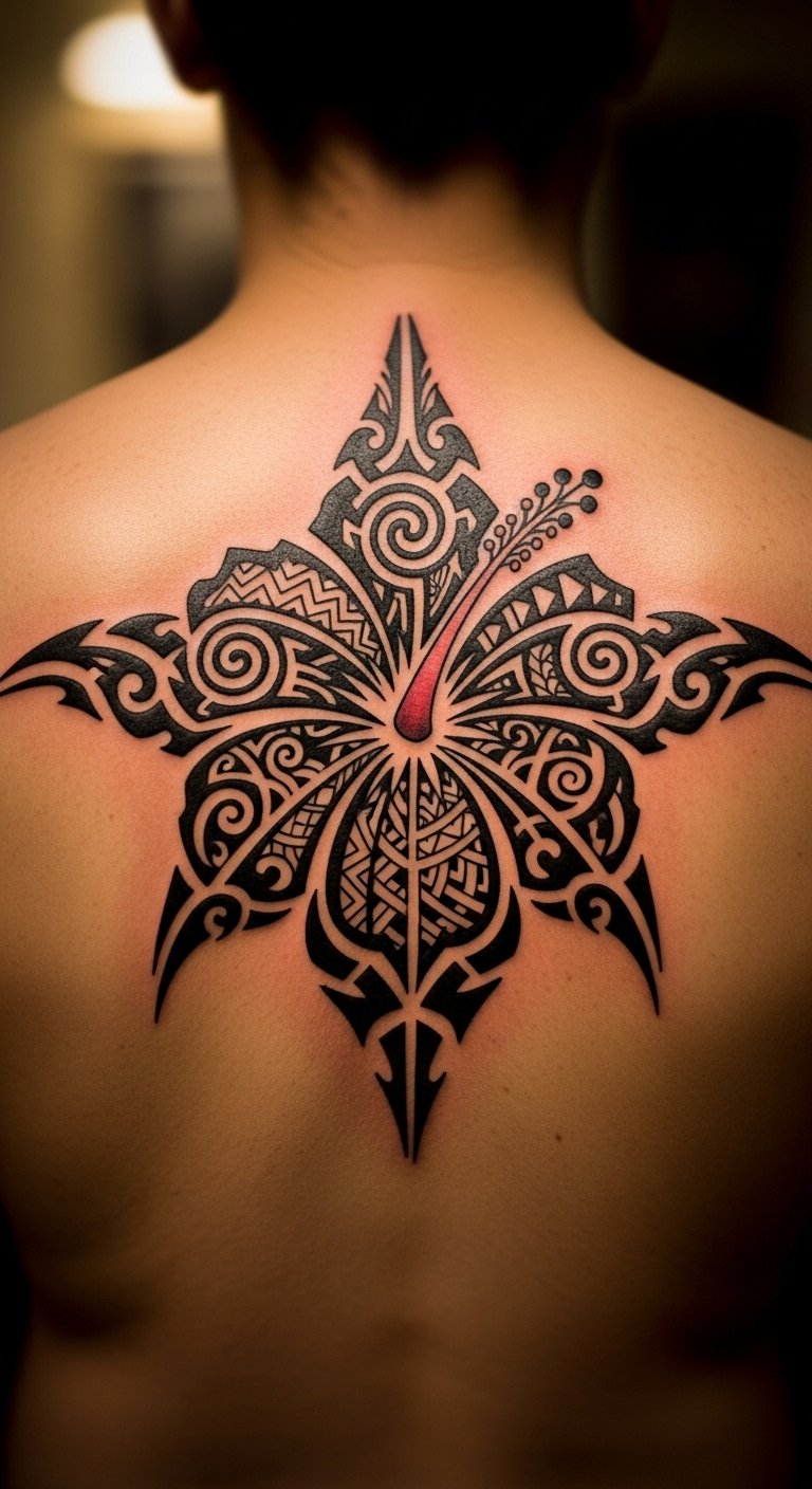 A tribal geometric hibiscus tattoo adorns your back. Draw cultural patterns simply. Use basic tools. Cultural resources are free online. Test with tribal temporaries for $5. They honor style. Seek tribal artists. Share patterns. Place it across your back for culture. Add tribal elements. Choose traditional ink to save. This means $50 off. Let it celebrate roots. It’s great for gatherings.
