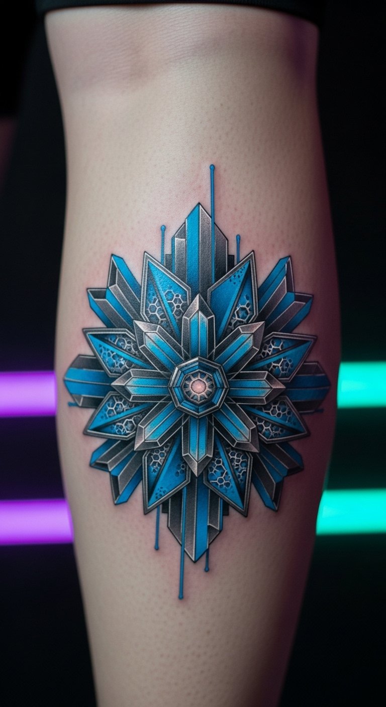 A futuristic geometric aster tattoo futures your leg. Design advanced shapes on paper. Use modern apps. Free futuristic ideas abound. Try advanced stickers for $4. They preview tech. Find futuristic creators. Talk tech. Put it on your leg for forward look. Add future twists. Go for metallic shades to keep costs down. You might save $30. Make it your vision. It’s ideal for tech fans.