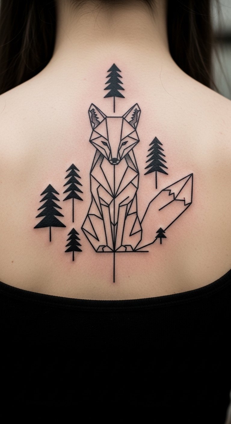 Incorporate forest shapes around a geometric fox. Use crayons on old paper to plan. Free nature images online inspire you. Choose your back for a larger canvas. This adds harmony with basic lines. Gather leaves from outside for natural stencils. Modify elements to fit your story. Get a tattoo artist for smooth blending, but try drawing first. It keeps costs low and ideas fresh. Express the fox’s grace this way.