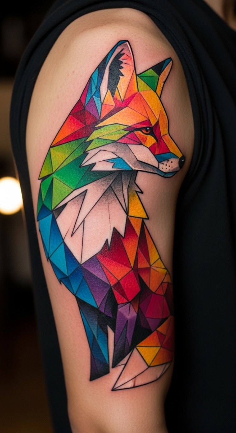 Vary colors in a geometric fox on your arm. Test with watercolors on paper. Free palettes online assist. Place on upper arm for visibility. This adds energy with mixes. Blend paints yourself. Adjust for skin match. Tattoos bring it to life, but sketch first. Budget-friendly creativity.