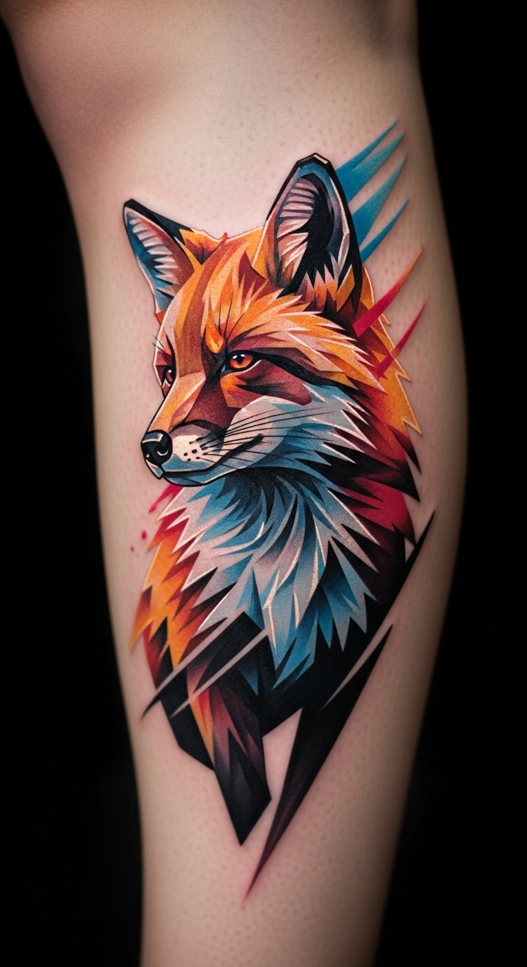 Dynamic patterns energize a fox on your leg. Sketch movement on paper. Free energy patterns help. Place on leg for action. This uses lines for vibe. Draw with quick strokes. Adapt for your energy. Tattoos capture it, but practice first. Budget-friendly dynamism.