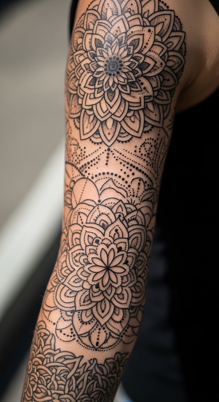 Geometric mandala sleeves use circles and lines for a balanced feel. Start with a basic sketch on paper using a pen. Draw small mandalas on your notebook to test ideas. Pick a spot on your arm that shows off the design. Talk to a local artist who works with simple tools. They can use black ink for a clean finish. Add elements like dots for extra flair. Keep costs low by choosing a half-sleeve option. This might run under a few hundred dollars at a budget shop. Try tracing patterns from free online templates. Wear a short-sleeve shirt to imagine how it looks daily. Focus on shapes that match your style. Get feedback from friends before committing. A good artist will adjust based on your input.