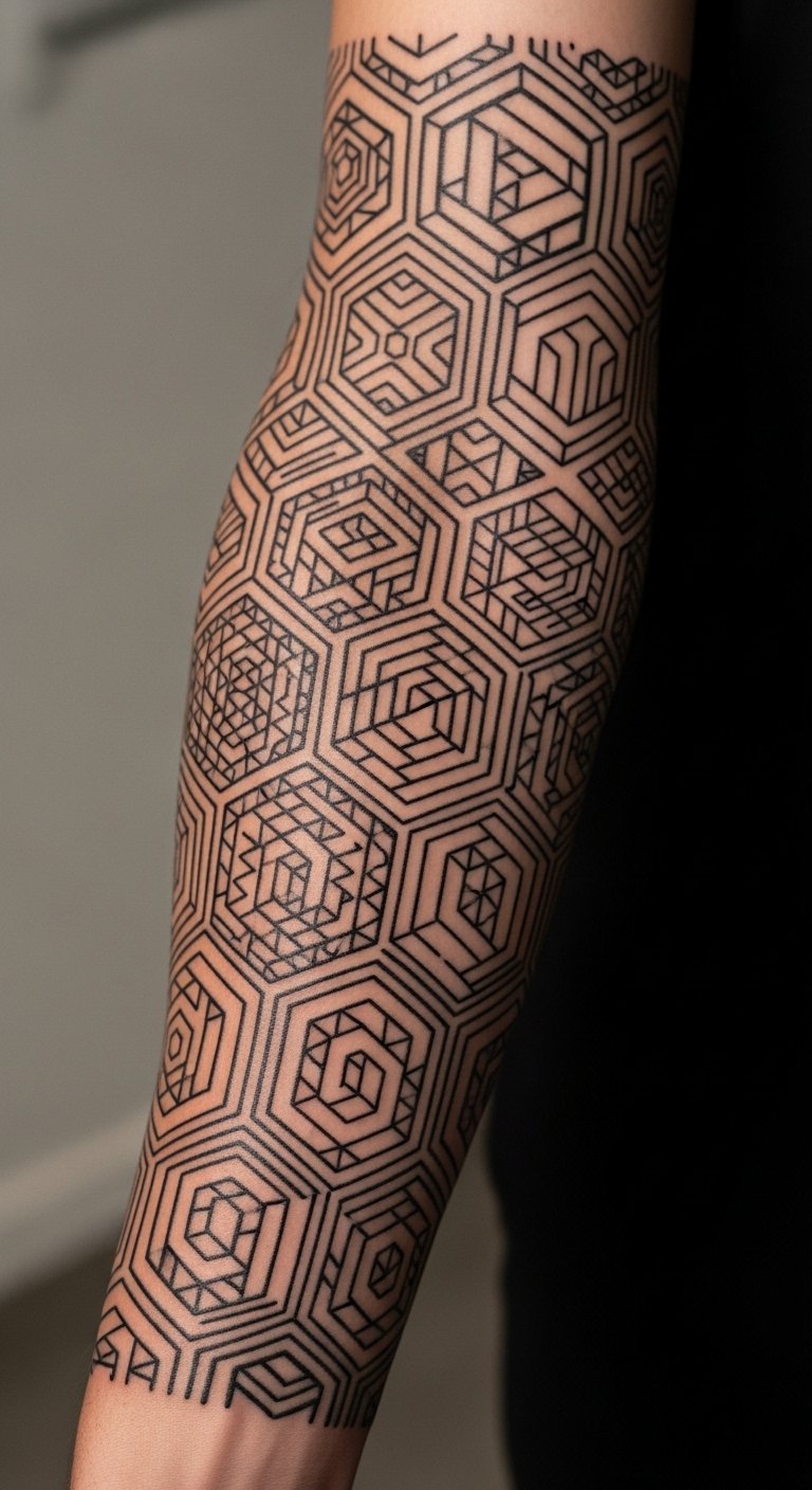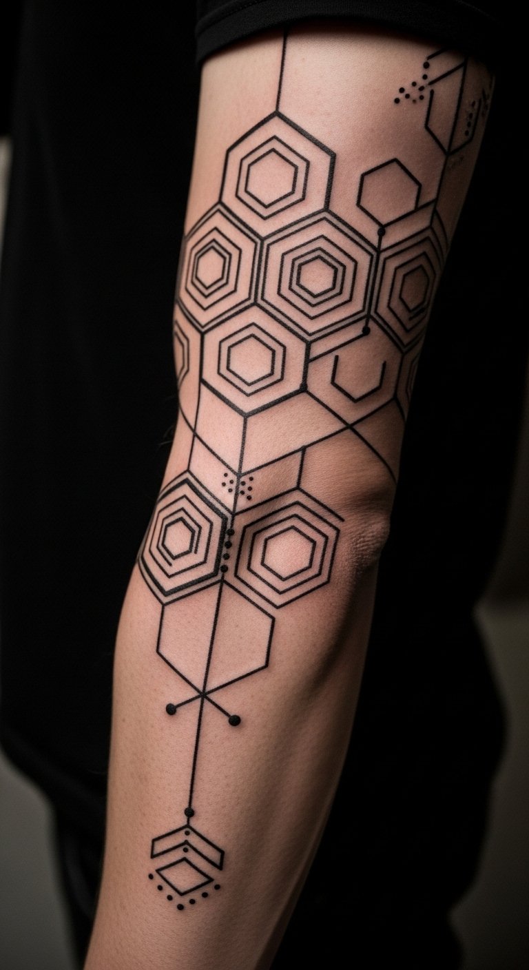 Interlocking hexagons create a structured sleeve with linked shapes. Draw hexagons on graph paper to plan. Connect them to form a grid. Fit them on your forearm for easy viewing. Search for artists who handle geometric layouts. Choose hexagons in basic black for simplicity. This design scales down for budget reasons. Look for introductory rates at local parlors. Trace hexagons on your arm with washable markers first. It helps visualize the final look. Adjust based on how it feels in motion. Share your drawing with the artist for input.