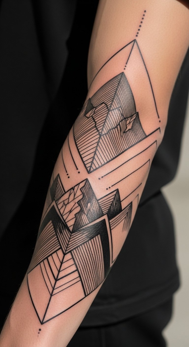 Angular mountain scenes use peaks and lines for a landscape vibe. Draw jagged mountains on drawing paper. Add lines for paths. Position on your sleeve for a story feel. Find an artist good with scenery elements. Use black outlines for clarity. Opt for a section to save money. Scout for package deals online. Tape paper mountains to your arm to test. It offers a quick view. Ensure the design fits your activities. Discuss details with the artist beforehand.