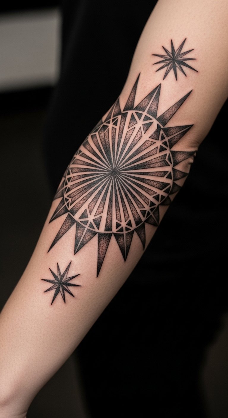 Radial star designs radiate from a point for a starburst look. Draw stars with lines from a center on paper. Expand outward for effect. Locate on your sleeve center. Seek artists skilled in radial work. Use black ink for precision. Go partial to manage costs. Find group session discounts. Draw stars with chalk on your arm first. It helps see the spread. Make sure it suits your style. Talk through ideas with the artist.