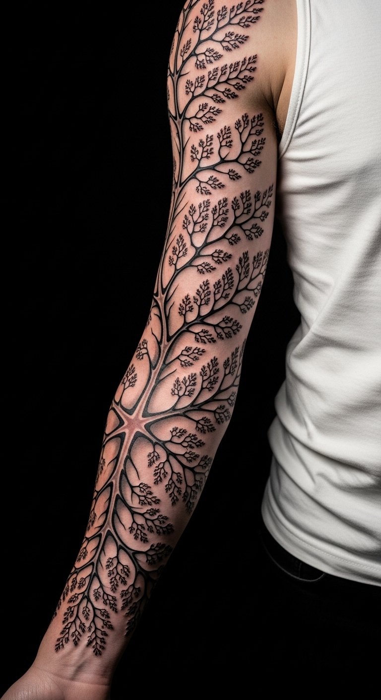 Fractal tree branches mimic nature with repeating lines. Sketch tree forks on paper. Add details for complexity. Place along your arm flow. Connect with fractal-focused artists. Opt for black lines only. Start with branches to keep budget in check. Look for artist specials. Use branches from nature photos as guides. Tape them on to visualize. Ensure comfort in wear. Refine with artist input.