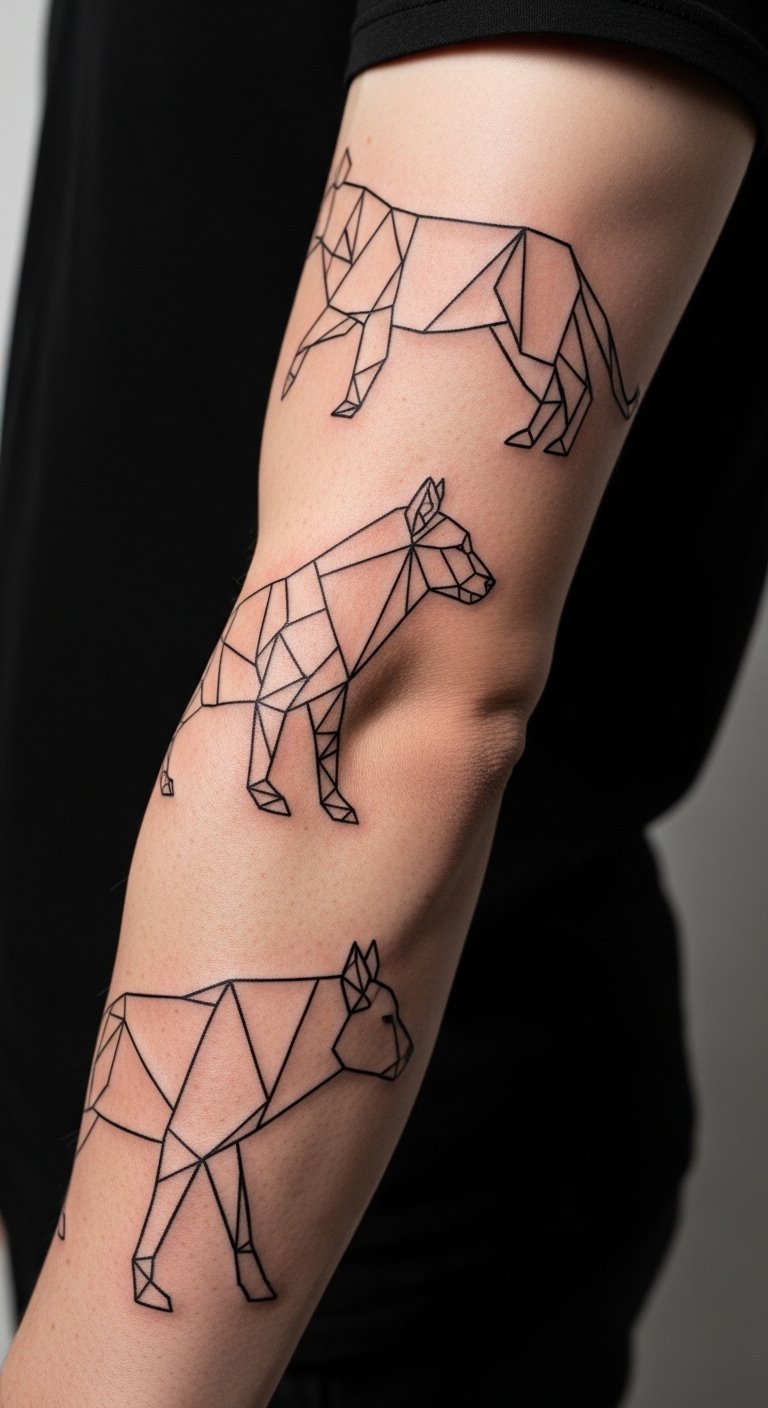 Geometric animal silhouettes turn animals into shapes. Draw simple animal outlines on paper. Add geometric twists. Fit on your sleeve for fun. Find artists who mix themes. Use black for clean cuts. Pick one animal to start cheap. Watch for walk-in deals. Cut out animal shapes from paper for trials. This shows placement. Keep it fun and functional. Get artist feedback quickly.