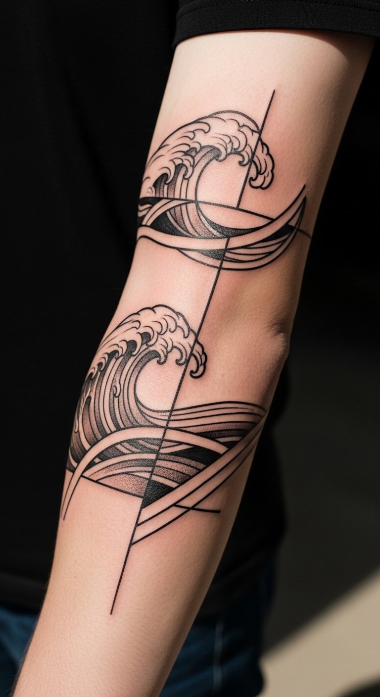 Wave and line hybrids mix curves and straights. Sketch waves with lines on paper. Blend for harmony. Locate on your sleeve blend. Connect with hybrid artists. Go black for unity. Start with a hybrid piece. Watch for deals. Tape wave-line combos on. It previews the mix. Make sure it fits. Discuss with the artist.