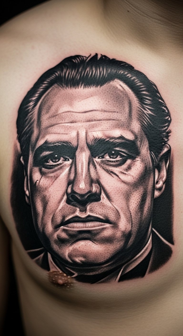 Think about a tattoo that puts Marlon Brando’s face front and center. This design captures the Godfather’s intense stare. Start with a simple sketch on paper. Use online tools to trace the image. Pick a local artist who does portraits well. Keep costs low by choosing a smaller size. Add your family initial next to it for a personal touch. This makes it more than just art. It’s a nod to leadership. Go for upper arm placement if you want it visible. Black ink works best here. It lasts longer and looks sharp. Try practicing with temporary tattoos first. They cost little and let you test the idea.