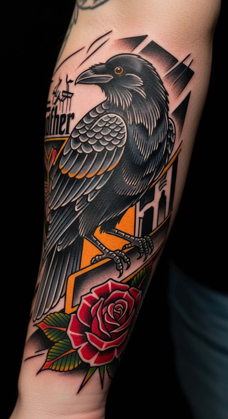 Ravens stand for loyalty in Godfather themes. Picture one in flight on your skin. Draw it out at home with basic pencils. Mix in simple feathers for extra flair. Find affordable stencils online to guide you. Place it on your shoulder for easy cover-up. Opt for colors that match your style. This keeps things budget-friendly. Use free apps to design your version. Add a small quote if it fits. It turns the tattoo into a story. Go small to save on artist fees. Test with henna designs first. They wash off and show how it might look.
