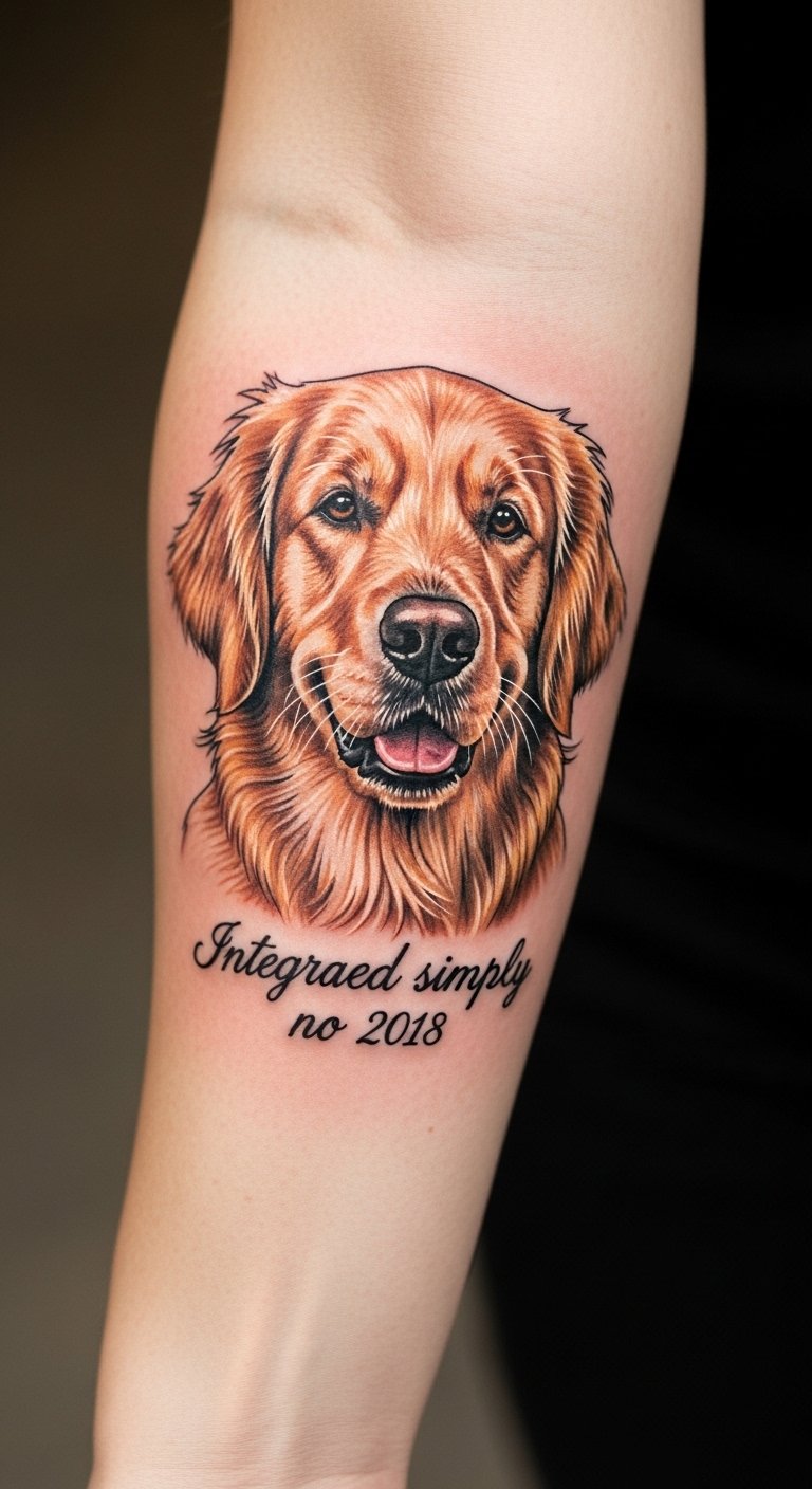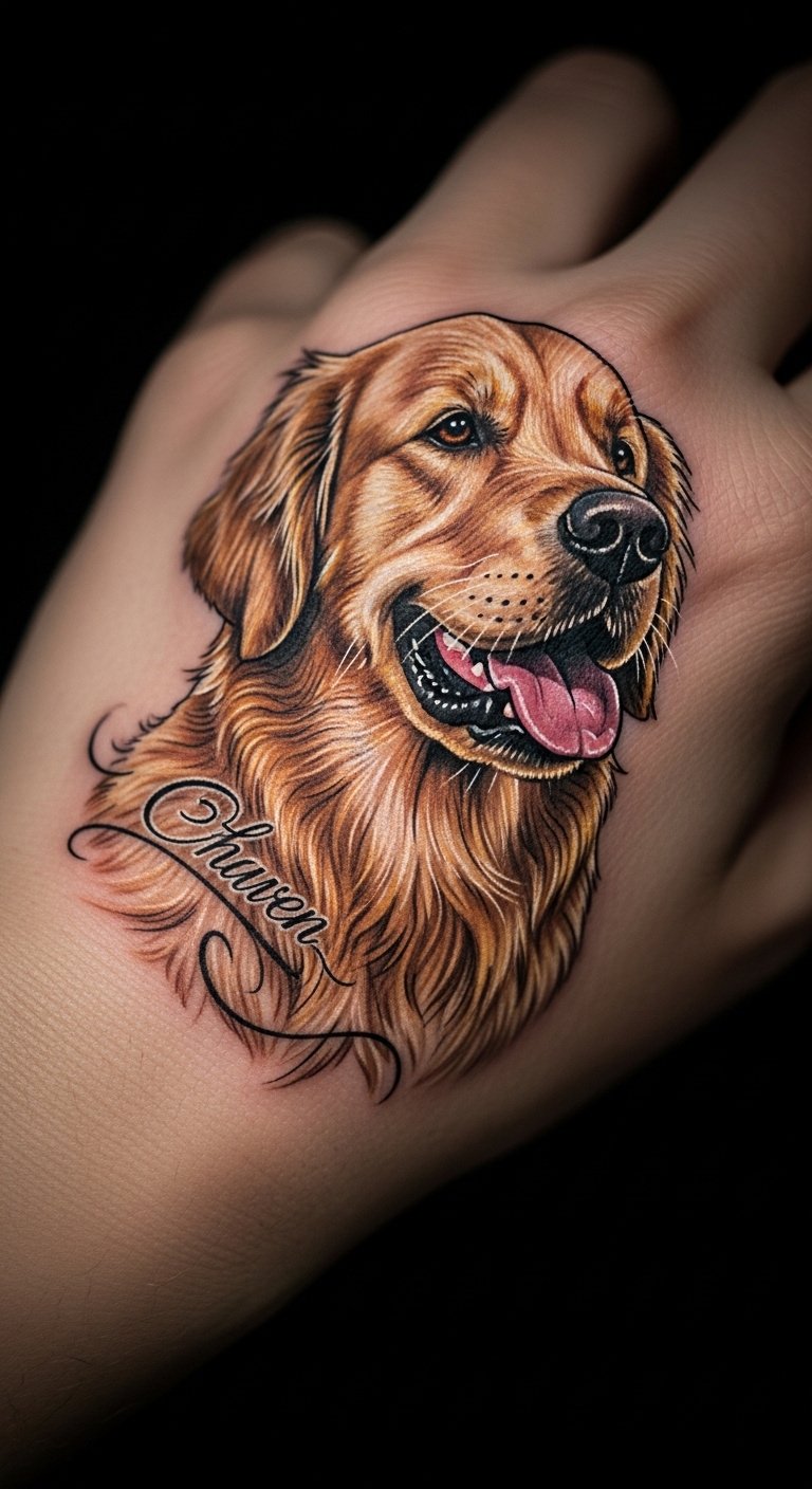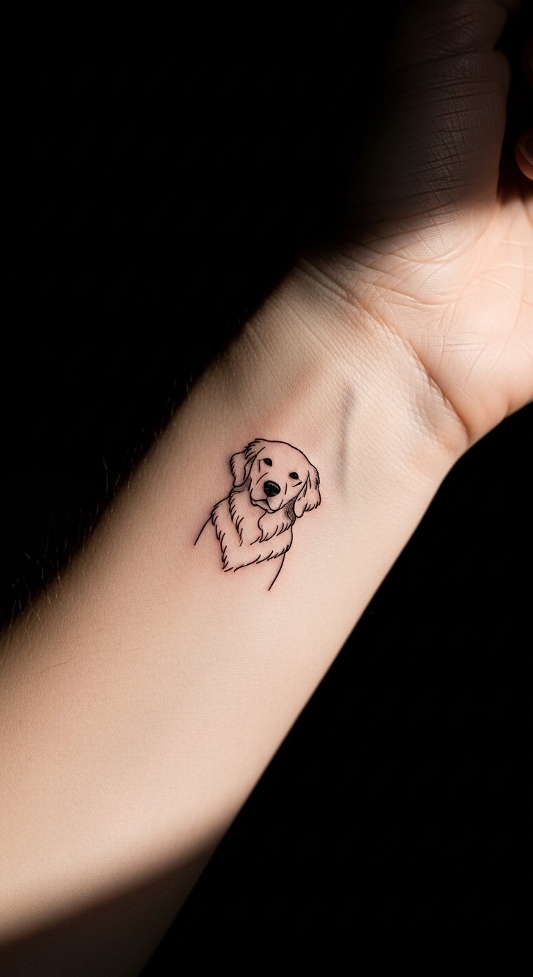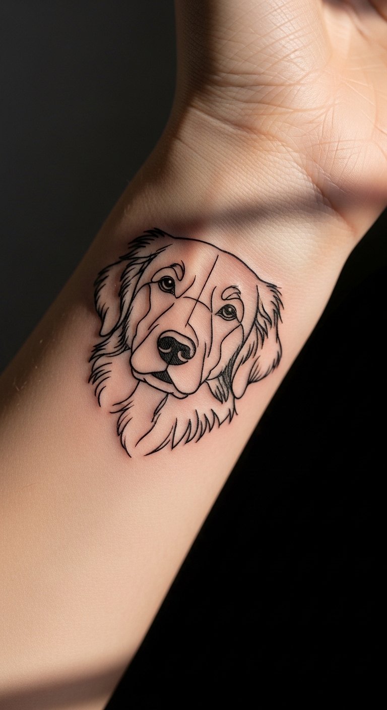 Picture a sleek line drawing of a Golden Retriever’s face. This style keeps things simple and elegant. Start with a basic sketch on paper at home using a pencil. It costs little and helps you visualize. Add your pet’s name for a personal touch. Go for a small size to save on artist fees. You might find free online templates to trace. This approach fits beginners. Try it on temporary tattoo paper first—it’s affordable and reusable. Focus on spots like the wrist for easy hiding. You’ll love how it highlights loyalty without overwhelming your skin. Keep maintenance easy with daily moisturizer.