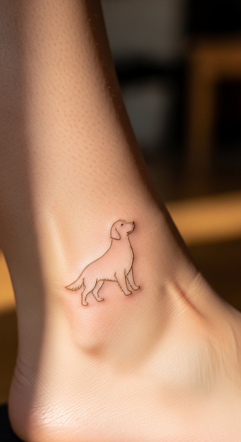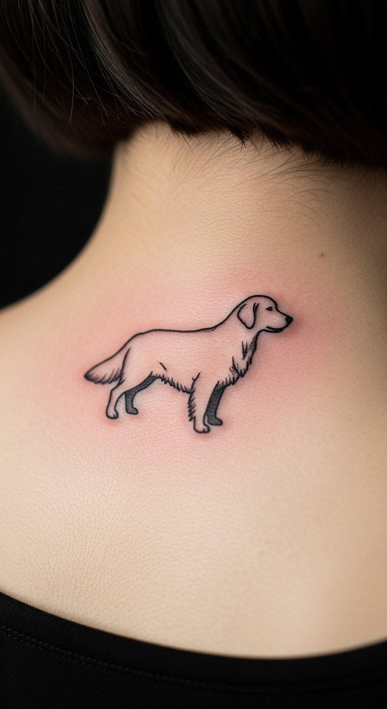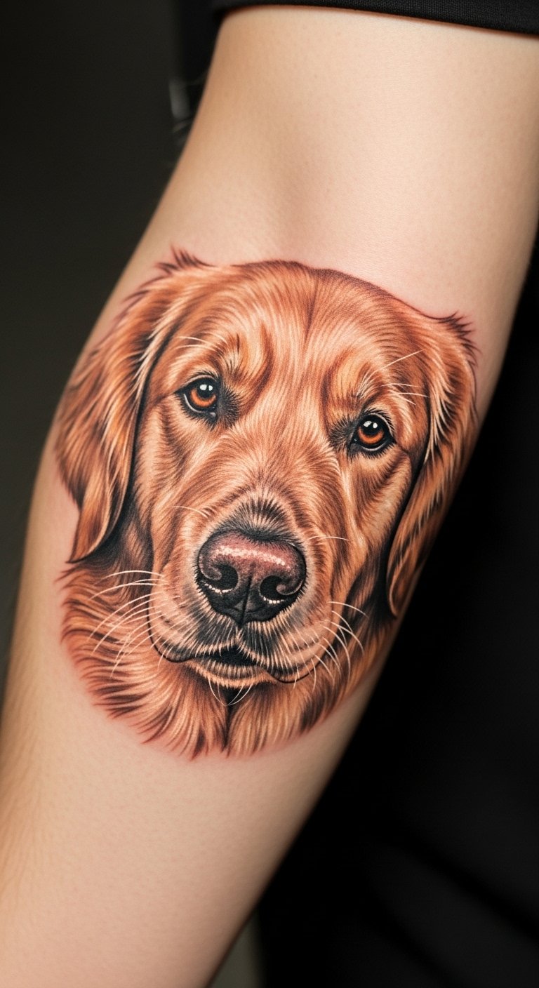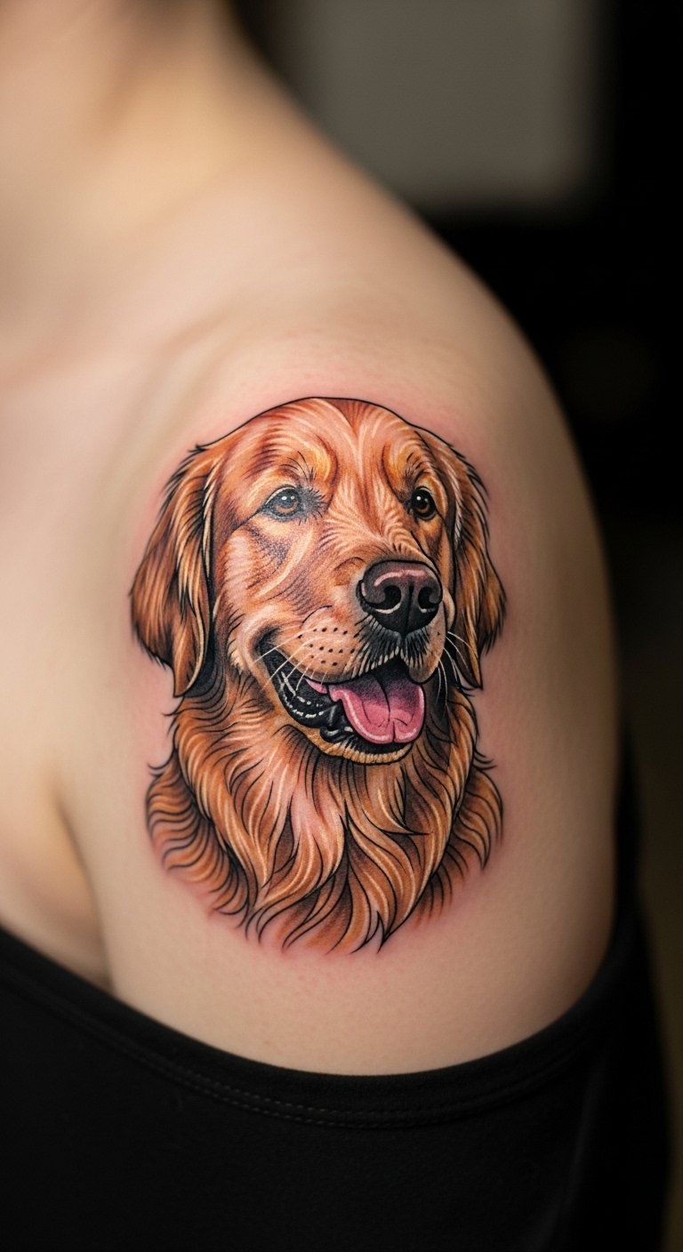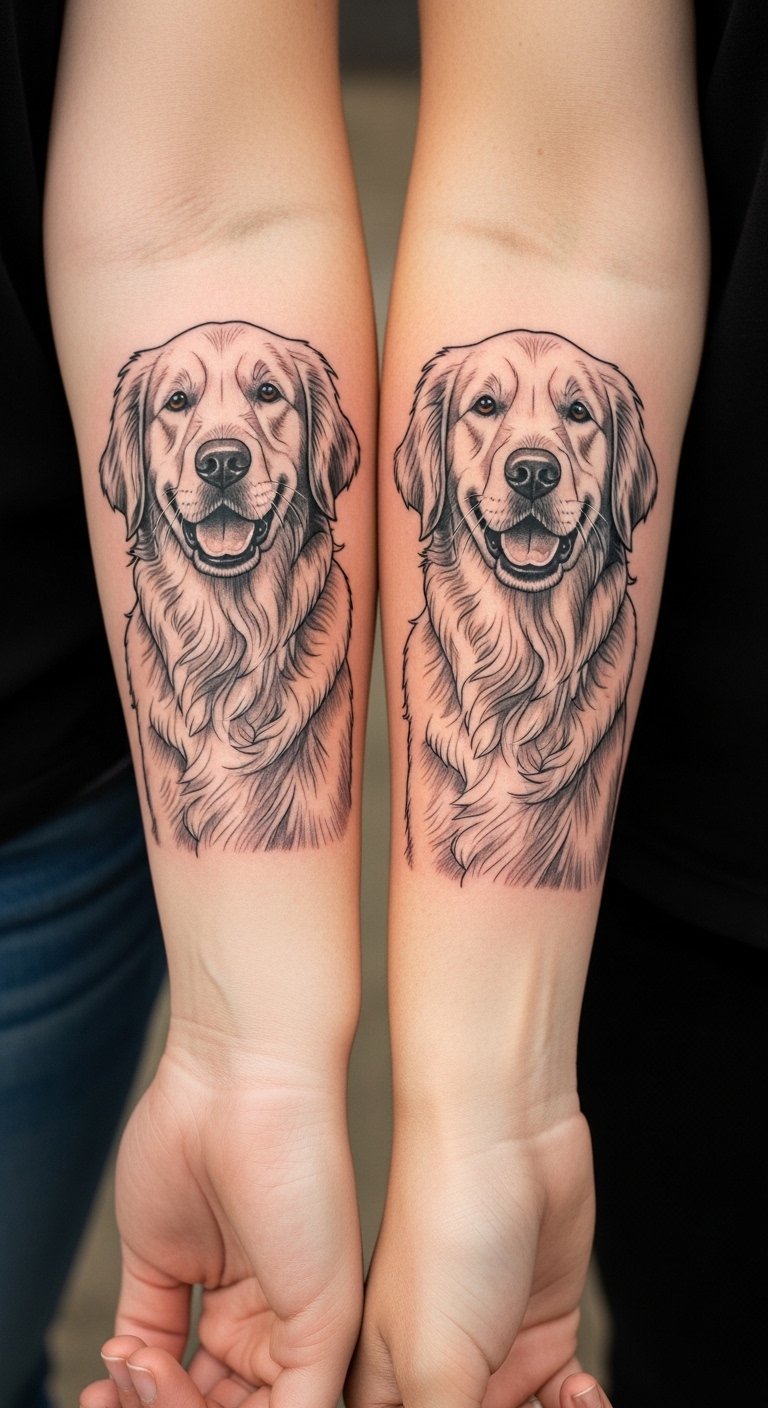 Picture a sleek line drawing of a Golden Retriever’s face. This style keeps things simple and elegant. Start with a basic sketch on paper at home using a pencil. It costs little and helps you visualize. Add your pet’s name for a personal touch. Go for a small size to save on artist fees. You might find free online templates to trace. This approach fits beginners. Try it on temporary tattoo paper first—it’s affordable and reusable. Focus on spots like the wrist for easy hiding. You’ll love how it highlights loyalty without overwhelming your skin. Keep maintenance easy with daily moisturizer.